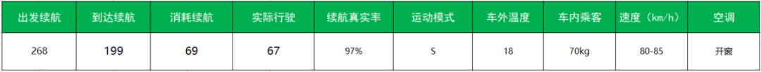 从上表看出,在当前春天温度环境下,续航真实率为97%。行驶速度较快,基本在80-85km/h。能在这个速度下达到这个真实率,1180KG的车重,可以接受。 另外,因为采用了运动模式,所以续航消耗也会增加。测试结束后,挡位在S挡时,剩余续航为199km,挡位在D挡时,剩余续航为204km。由此推算,D挡行驶时,续航真实率100%没问题。