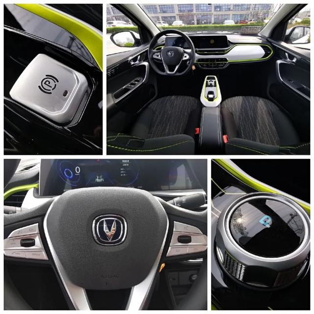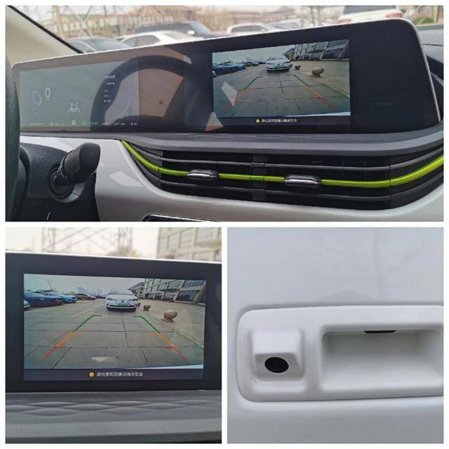 前脸鲨鱼腮下用了三条鹅黄色饰条,车内换挡区域和前排操作台区域都使用了鹅黄色饰条,让车内的气氛一下子年轻起来。这种色彩我是第一次在车上见到,大胆创新,匹配白色饰板,让传统的黑色内饰增加了活力。座椅条纹采用鹅黄色和白色电流线搭配,也增加了电动汽车的环保感。 二就是贯穿式横屏,科技感强烈,让车内的科技氛围瞬间提升。 3、实用的科技很多 印象中,占号神器的配置也是简陋的,但奔奔E-Star的配置也突破了这一点。好多实用的科技配置。例如: 全系标配后倒车雷达,高配版配备倒车影像。另外全系标配电子手刹。