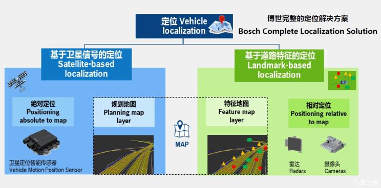 『博世定位解决方案』 基于卫星的绝对定位:博世开发出了卫星定位智能传感器(VMPS),集成为了高精度惯导IMU及旌旗灯号纠偏服务,能包管多种工况下定位不乱,精度可达20厘米之内。 基于博世道路特性的相对于定位:在2017年,博世以及baidu、高德和四维图新三家图商互助推出了“博世道路特性(BRS)”,它的事情原理实际上是,经由过程车载传感器(摄像头、雷达)收集天生道路特性数据,并及时上传到云端后台与高精度舆图进行比对,以此来肯定汽车在当前车道中的位置,从而实现厘米级定位。 实在,针对高精度定位解决方案,今朝业内泛起了两种技能路径。像高德、四维图新如许的专业图商,他们自己有拥有笼盖区域更广、更精准的高精度舆图,再辅以低本钱的传感器设置装备摆设(好比四维图新采纳了16线的激光雷达),就实现了汽车高精度定位。而博世以及Mobileye这种供给商则正好相反,他们是基于高辨别率的传感器设置装备摆设(比方Mobileye的道路体验经管体系REM方案中是纯视觉,而博世则另有雷达,应答繁杂情况更靠得住),共同相对于低精度的舆图。不外,后一种方案,必要壮大的人工智能(AI)算法。