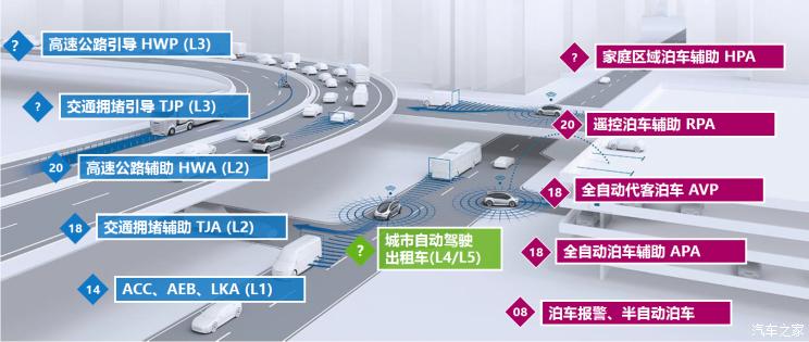 『博世主动驾驶三年夜运用场景』 博世的主动驾驶技能主要分为三年夜场景:低速主动停车场景、高速路主动驾驶,和都会内的无人驾驶出租车/小巴。 2018年,博世推出了最新的全主动停车辅助(APA)以及全主动代客停车(AVP)。L2级的交通拥挤辅助/集成式巡航节制(TJA/ICA)功能也已经量产,包含吉祥博瑞GE(参数|图片)、长安CS55(参数|图片)、荣威MARVEL X(参数|图片)和威马EX5等车型都已经搭载。 博世要量产的下一代主动驾驶功能是高速公路辅助(HWA),与特斯拉的Autopilot有雷同的地方,也属于L2.5级,量产时间年夜约在2020年。而L3的高速主动驾驶则要在2020年之后才气推出。