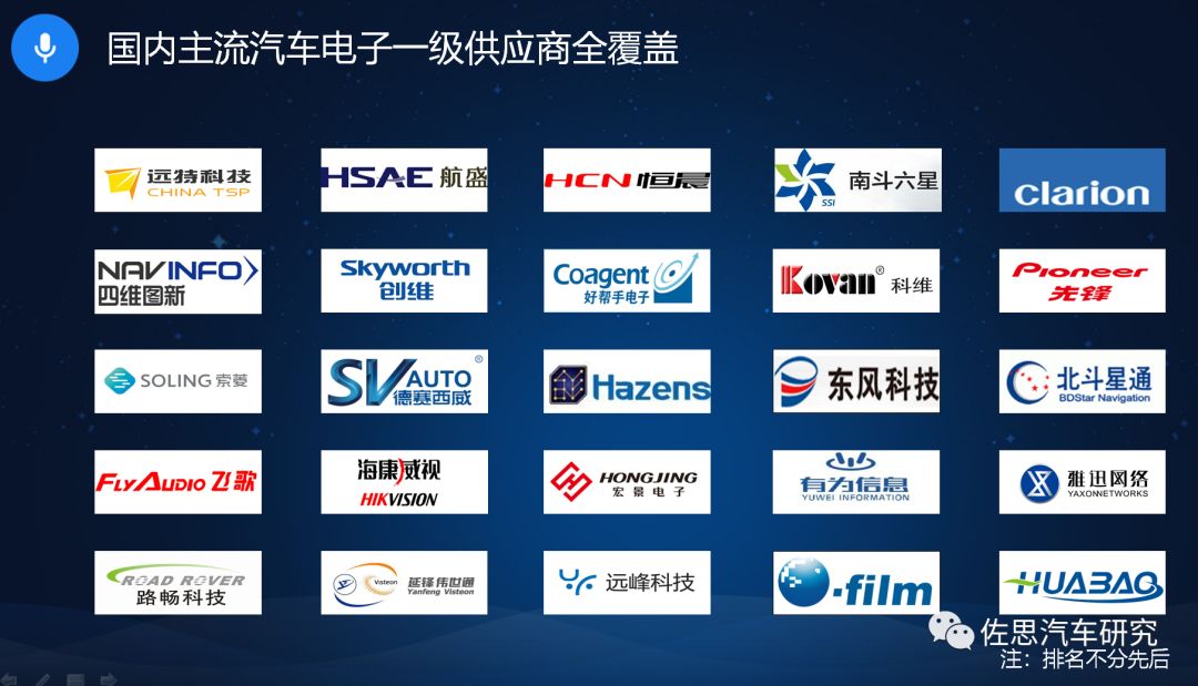 这是咱们互助的一些前装的客户,从传统汽车,新能源车,另有客车、货车、商用车,咱们根本上全数笼盖了。上汽、广汽、一汽等等车企咱们都有互助。 如下是Tier1的环境,如今根本上海内主流的汽车电子一级供给商咱们都笼盖了,好比说德赛、远特等都有。
