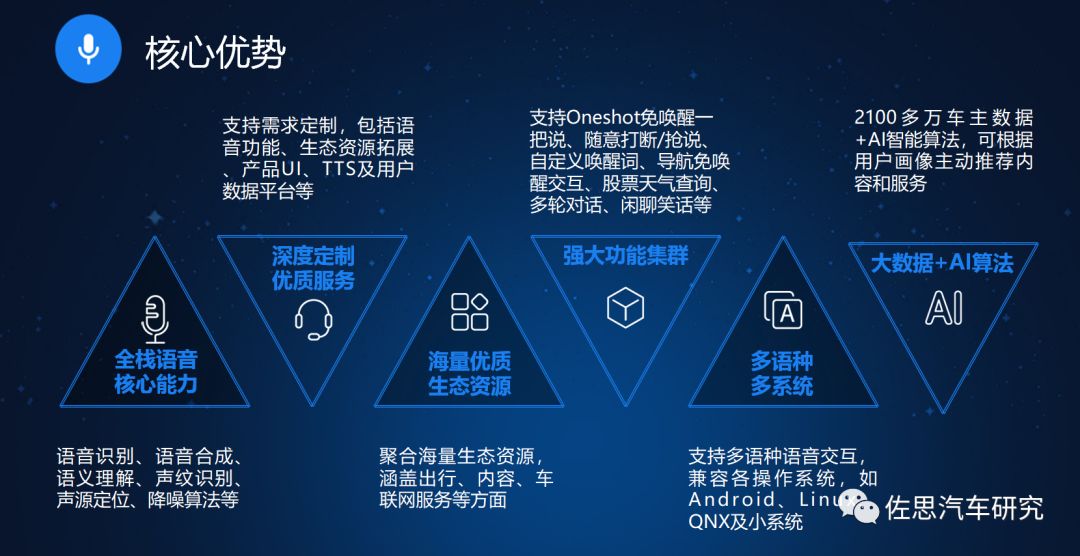 今朝在车机内里必要的语音能力,好比说语音辨认、语音合成、语义理解,包含声纹辨认、声源定位,咱们都是全数具有的。 其次咱们可以凭据客户的需求,定制怪异的产物的UI。乃至怪异的TTS,乃至帮你构建自有的用户数据平台,咱们但愿帮车企打造一个生态平台。由于以前汽车卖出去以后,车主以及汽车厂之间的瓜葛几近就没有了,若是你选择了咱们,咱们就能够帮你搭建一个车企平台,让你的服务能出患上去,用户的数据还能回患上来。 另外咱们拥有海量优质的生态资本,适才咱们讲智能硬件是离不开智能服务的,咱们聚合了海量的生态资本,涵盖了出行、内容以及车联网服务等方面。咱们另有很是壮大的功能,今朝在车内里可以支撑免叫醒的,以前你可能要说“你好,同业者,我要导航到深南年夜道”,如今你就能够直接说“我想去深南年夜道”,它就直接帮你导航,不必要叫醒。 另外咱们可以做到随便打断,适才在视频内里看到,当你说完一个指令以后,它尚未复兴完的时辰,咱们又立马从新给出一个新的指令,它照样可以反响过来,这就属于随便打断。由于咱们人在天然扳谈的时辰,有时辰当他人说一句话的时辰,咱们可能会打断他,以是咱们摹拟如许的天然交流场景去研发咱们的语音能力。同时你还可以自界说叫醒词,好比说你可以给它起个名字,另外你还可以在车内里查询股票、气候,可以进行问答。好比说你问他“发掘机技能哪家”,它就直接答复说“山东济南找蓝翔”。 另有支撑多语种的语音交互,咱们今朝已经经接入了8种语言,咱们兼容各类操纵体系,包含安卓、Linux,和其它小体系。 末了,同业者今朝是车联网拥有车主用户至多的公司,咱们沉淀了不少年夜数据,咱们可以经由过程这些数据自动对车主进行内容以及服务的推送,咱们认定车内里可能存在本日头条的机遇,好比说早上你要听新闻,咱们可以对应的给你推送响应的新闻,乃至一些告白。另外咱们认为它内里可能还存在一个分众传媒的机遇,汽车用户的质量很是高,他天天均匀使用要到达3个小时,他的消费能力也比力强,以是说既是精准领域,又是精准客户,还能做到精准投放。好比说你住在后海,你家的屋子是8万块钱一平米的,你如今开了一辆车,咱们断定这个车你可能已经经开了5年了,好比说你以前买的是一辆年夜众,这时候候咱们可能就会给你推荐一些宝马、奔跑这类级别高一点的车的优惠动静,乃至说一些试驾体验。这就是咱们将来的一个焦点的能力。 再说一下咱们今朝的市场环境。在后装市场方面,咱们是绝对的第一。在车机内里,咱们据有80%的市场份额,今朝在后装,10辆车内里至少有8辆是装的同业者的语音,可能你不知道同业者,可是可能用的就是咱们的语音。另一个是智能后视镜,有70%的市场份额。