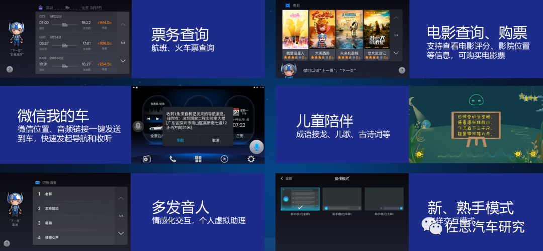 这内里就触及到咱们前面讲的一些语音技能在车内里的运用,它包含多轮对话、多重语义。咱们说“我饿了”,多是一个语义,若是说我说“我要找一小我均消费100元的湘菜馆”,它内里包括了两个意思,第一是“人均消费100元”,第二是“湘菜馆”,它可以或许理解一句话里边的多重意思。包含咱们前面放的第一个视频,咱们注重到并无说“打开天窗”,而是说的“我要看星星”,这类语义的处置是像天然措辞同样,“我要看星星”,它就帮你打开天窗,开启星空模式。 除了此之外,咱们还在车里做了不少的丰硕的功能以及人道化的体验,包含票务的查询,你可以用语音直接对屏幕说,“你好,同业者,帮我查一下来日诰日的航班”,而且你可以订机票、火车票。另一个你也能够查询片子,而且可以订票。第三是微信我的车,咱们做了一个微信公家号,以及车是买通的,你在微信公家号内里可以查看你的车的位置,包含你的行驶轨迹。另有儿童伴随,像针言接龙、童谣以及古诗词,你可以直接以及它对话。同时,咱们做了情绪化的交互,它主要解决的问题是,它可以像一小我的虚拟助理同样帮你解决不少问题,像一个行车的超等助手。另外,咱们也做了一些新、熟手模式,有些新手刚起头拿到这个车的时辰,他不会用,咱们会有一个新手模式,另外在每一次用的进程中,每一次语音指令打开的时辰,咱们有一个词叫“可见便可说”,当你想要实现甚么功能的时辰,它直接在屏幕上会把阿谁语音指令直接批示给你,如许就解决了不少人可能不懂指令不会使用的问题。