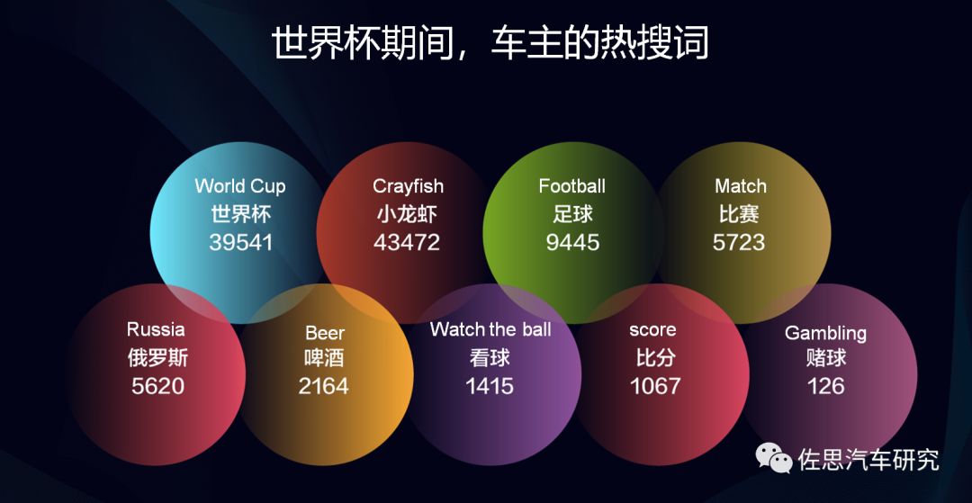下图是咱们在去年世界杯时代做的一个车主热搜词,在baidu内里有文字搜刮的关头词,在汽车内里咱们可以看到你使用语音的关头词,世界杯时代,像世界杯、小龙虾、足球角逐、俄罗斯,它的搜刮流量是很高的。