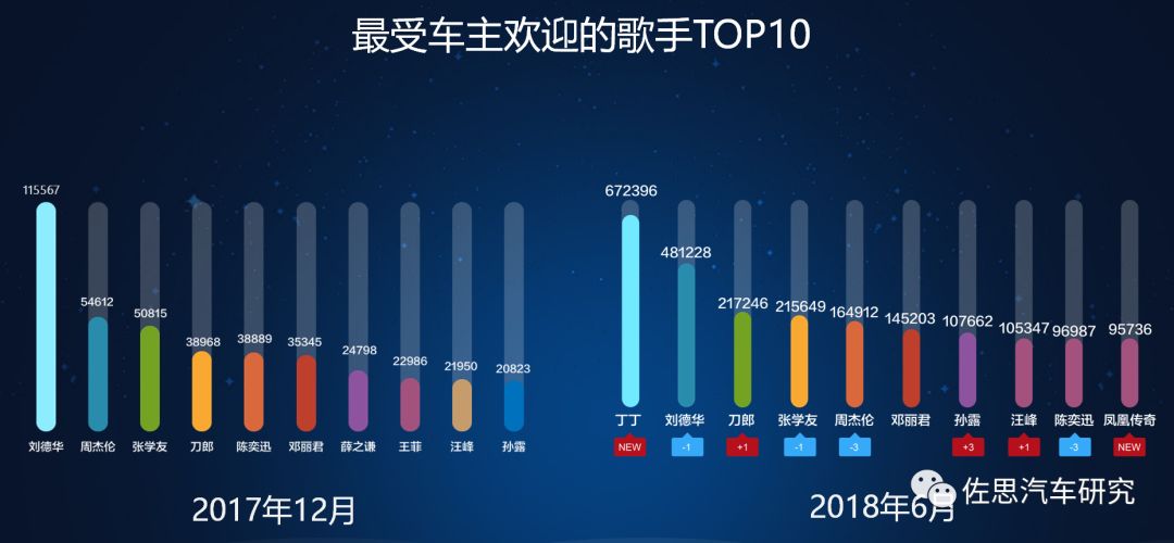 当你在车里收听音乐,咱们可以断定最受车主接待的歌手,年夜家可以看到,左侧是2017年12月,右侧是2018年6月,可以看到这个歌手的变革,从最受接待的是刘德华酿成了丁丁,车主的春秋条理仍是相对于比力高一点,以是说刘德华、张学友、刀郎、周杰伦这些明星仍是今朝车主最接待的歌手。