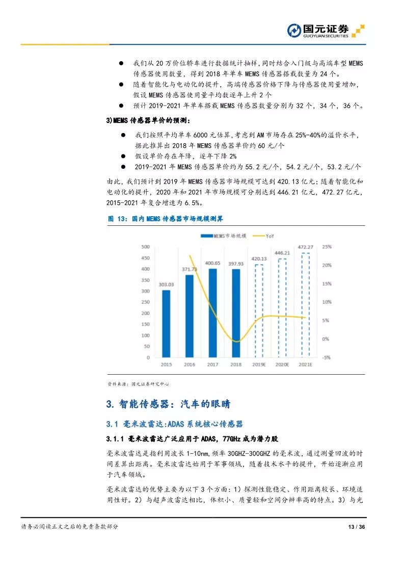 今朝均匀每一辆汽车包括24个MEMS传感器,而在高级汽车中,年夜约会采纳25-40个MEMS传感器。经常使用MEMS传感器后装单车价值在2000-20000元不等;合股车凡是不低于4000元,而自立品牌仅2000元摆布,高端车型约为10000-20000元。由此,咱们预计跟着国六尺度履行对排放检测要求的晋升和汽车“智电化”趋向海潮影响,我国MEMS传感器市场近延续稳步增加,到2021年到达472.27亿元市场规模。