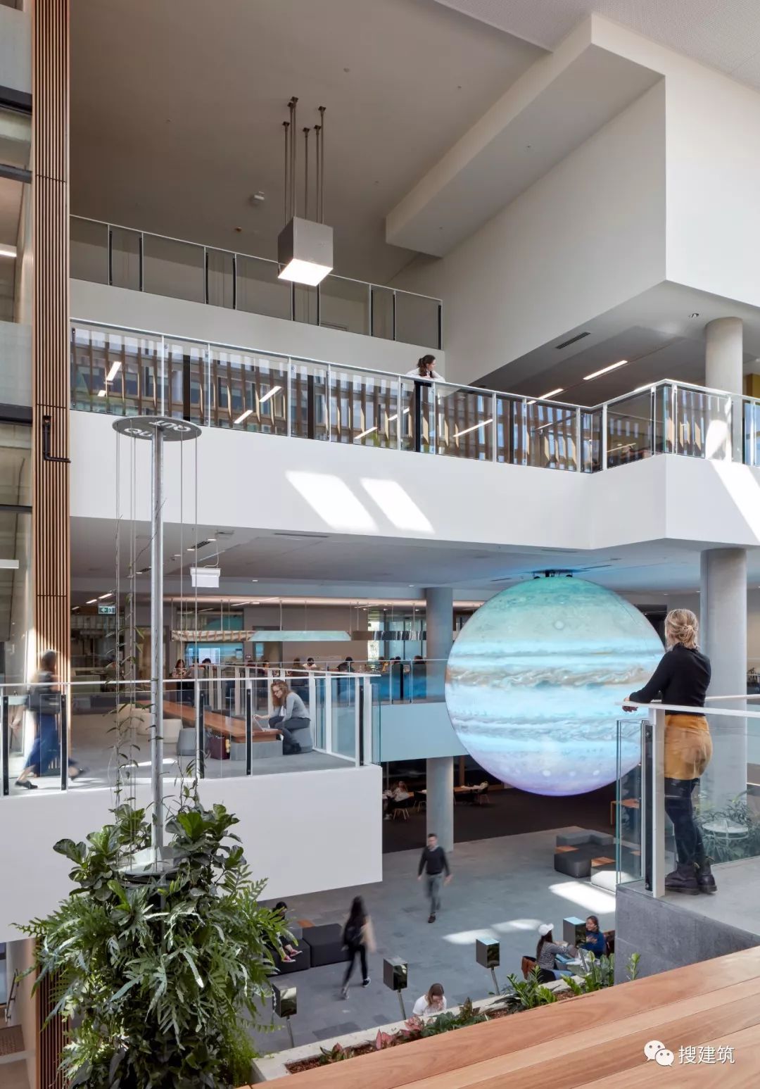 不管是室内仍是室外的绿色交际空间都约请旅客将该建筑作为一个更非正式的集会地址,缔造一个活泼的校园糊口十字路口。透过玻璃立面可以看到直径5米的LED球体的发光情势,悬浮在中庭地板上。该装配和学生可节制的壁挂式显示器,付与了教诲学院丰硕多彩之处特点,体现了年夜学在技能立异方面的许诺。 Planted green social spaces both indoors and out invite visitors to use the building as a more informal meeting point, creating an active crossroads of campus life. Visible through the glass facade is the luminous form of a LED sphere five meters in diameter, suspended over the atrium floor. The installation, along with wall-mounted displays controllable by students, gives the Faculty of Education building a colorful local identity and embody the University’s co妹妹itment to creativity in technology.