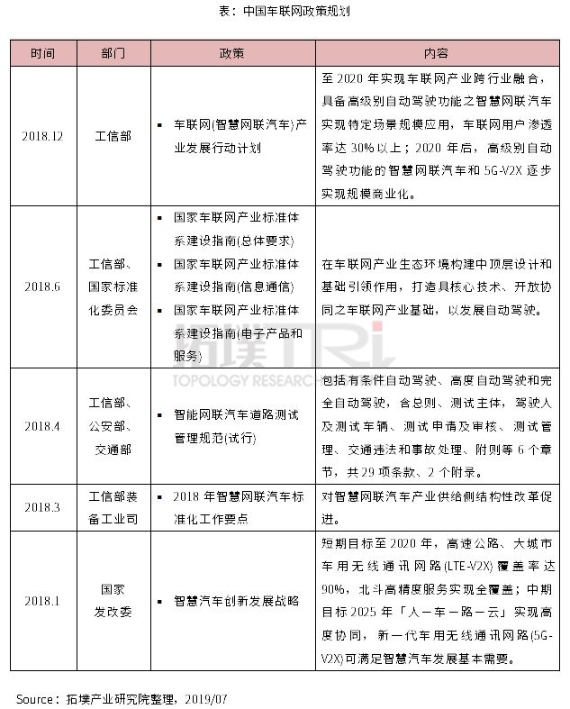 车联网运用在中国政策支撑下进入发展期 中国车联网政策制订主要从国度上层设计以及协调计划,涵盖车联网落地运用服务,今朝总体工业成长路径已经慢慢清楚,此中包含尺度制订、关头技能研发、网络装备结构、运用商用化等推动,主轴分为V2X以及高精度根蒂根基举措措施,自2018年1月起,发改委发布「智能汽车立异成长战略(征求定见稿)」,明订中国车联网短、中、持久成长方针。 2019年4月C-V2X商(参数|图片)用路标在上海颁布,长安、一汽、上汽、广汽、春风、北汽、江淮、长城、东南、众泰、江铃团体新能源、比亚迪、宇通等13家车商颁布发表声援C-V2X商用路标,方针C-V2X模块汽车将于2020下半年~2021上半年上市。