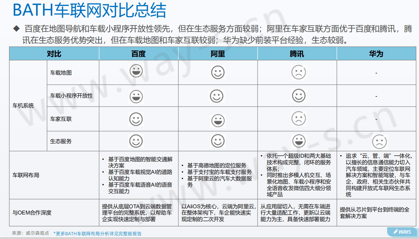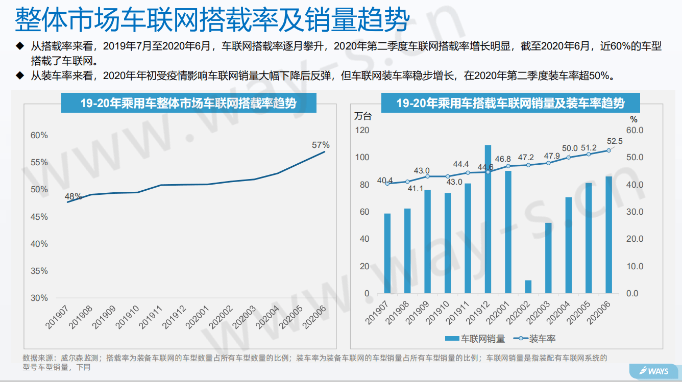 近年来,随着电动化、智能化、共享化、网联化的深入推进,车联网的发展日益提速。因此,在政策、技术、产业三重因素的推动下,有业内人士表示,2020年或将成为车联网规模化落地的元年。 近日,研究机构威尔森发布了一篇题为《车联网发展格局分析》的报告,该报告从政策、车联网搭载趋势、企业战略以及BATH车联网对比分析四个方面对2020年上半年车联网发展进行回顾。 政策利好,对于产业发展的助力无需多言。 2018年,工业和信息化部与国家标准委联合印发《国家车联网 产业标准体系建设指南(总体要求)》《国家车联网产业标准体系建设指南(信息通信)》和《国家车联网产业标准体系建设指南(电子产品和服务)》系列文件,确定到2020年,基本建成国家车联网产业标准体系 今年以来,国家相关部门纷纷出台指导文件,全面推动车联网产业技术研发和标准制定,5G及车联网协同发展。 产业方面,今年受到疫情影响,车联网的销售在年初出现大幅下降,但随着疫情的控制,销量也出现反弹。不过,在装车率上,车联网的装车率却是在稳步上升。报告显示,2020年第二季度装车率超过50%。 从搭载率来说,2019年7月至2020年6月,车联网搭载率逐月攀升,2020年第二季度车联网搭载率增长明显,截至2020年6月,近60%的车型搭载了车联网。
