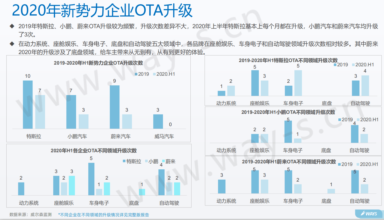 不过,目前在车联网市场上,BATH是表现最为抢眼的四大巨头。报告显示,在四大巨头在车联网布局方面,百度在地图导航和车载小程序开放性领先,但在生态服务方面较弱,阿里在车家互联方面优于百度和腾讯,腾讯在生态服务优势突出,但在车载地图和车家互联较弱,华为则缺少前装平台经验,生态较弱。 当然,汽车市场上还有一股新势力,他们在车联网领域并不过多依赖某一方,同时,自身还承担起了后期车辆运营服务商的角色。 据报告显示,2019年,特斯拉、小鹏、蔚来OTA升级较为频繁,升级次数差异不大,2020年上半年,特斯拉基本每个月都在升级,小鹏汽车和蔚来汽车均升级了3次。