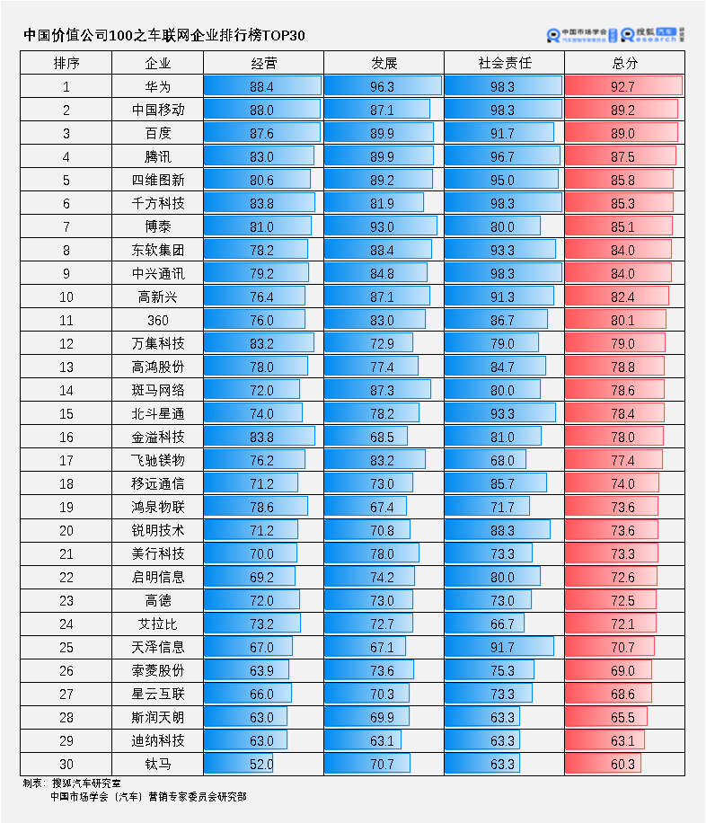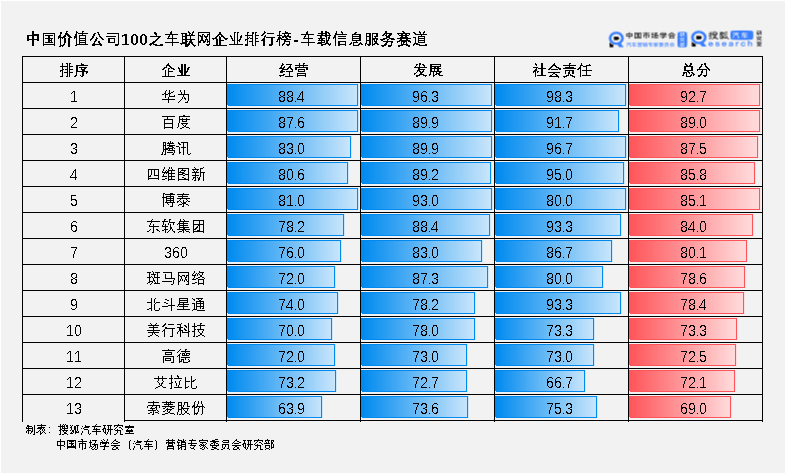 本文摘要: (1) 为紧跟车联网行业发展动态,聚焦优质市场主体,中国价值公司100排行榜之车联网企业排行榜从经营分析、发展能力以及社会责任三个维度对30家车联网重点企业进行综合评分; (2) 车载信息服务领域,市场主体多样,角色多元,以百度、腾讯、博泰、四维图新为代表的科技企业建立涵盖地图导航、影音娱乐、操作系统、OTA、车联网安全等内容丰富的业务拼图; (3) 数字化运营领域,车联网云平台、大数据平台为企业核心资产,科技巨头深入布局企业服务与移动出行,飞驰镁物、鸿泉物联、锐明技术等细分龙头深耕物流、客运等垂直市场; (4) 车路协同领域,在华为、中国移动、百度等企业的引领下,互联网、ICT产业与汽车、交通走向深度融合,“端”、“管”、“云”产业链结构日渐完善。 随着4G/5G等信息通信技术的快速发展,车联网迎来了产业发展的春天。借助于人、车、路、云之间的全方位连接和信息交互,催生了大量新的产品应用,满足人们对车载信息服务和交通安全效率的更高要求。 它涉及汽车、电子、信息通信、交通等多个产业,产业链条长,角色丰富,跨界融合特征突出,已形成千亿级的国内市场规模。催生出一批以博泰、四维图新、高新兴、飞驰镁物等为代表的车联网优秀企业,吸引华为、中兴、百度、中国移动等ICT巨头跨界布局。 本文聚焦车联网产业生态,通过梳理车联网车载信息服务、数字化运营、车路协同(C-V2X)三大赛道,探究产业链格局和企业发展情况。 01 车联网企业排行榜 在信息通信、移动互联网技术的推动下,车联网应用场景愈加丰富,市场主体空前繁荣,产业规模快速提升。为紧跟车联网行业发展动态,聚焦优质市场主体,搜狐汽车从车联网产业链中梳理出30家头部企业,从经营分析、发展能力以及社会责任三个维度对企业进行综合评分,具体评判标准如下: