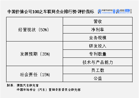 1. 经营现状(占比50%) 包含企业营收、净利率、业务规模三个指标,其中“业务规模”综合考量企业当前在车联网领域业务规模、项目布局情况以及产业链上下游合作关系。 2. 发展预期(占比35%) 包含研发投入、专利情况以及技术与产品能力三个指标,其中“研发投入”涉及研发投入金额、研发人员数量、研发占营收比重,“技术与产品能力”综合考量企业业务种类与细分领域技术成熟度。 3. 社会责任(占比15%) 包含员工数、公益两个细分指标。其中“公益”为综合考虑环保、公益投入、公益项目进度等多维度的得分。 由此得出中国价值公司100排行榜之车联网企业排行榜,具体排名如下: