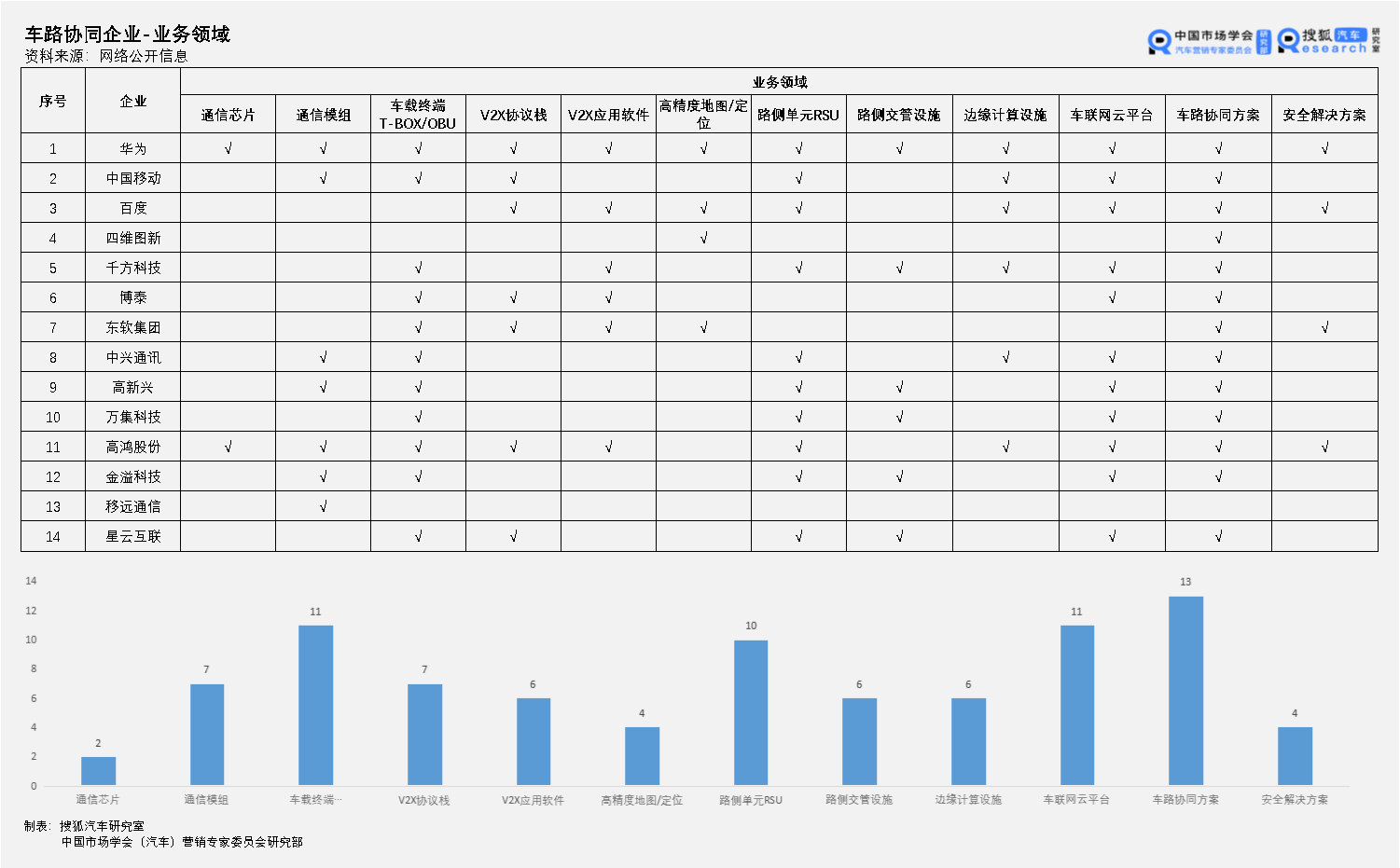 14家车路协同服务企业的业务分布情况如下: