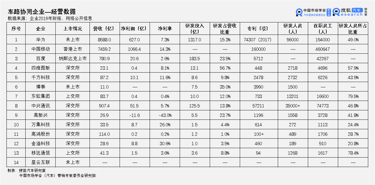 14家头部企业包含通讯企业(华为、中兴、高鸿股份)、运营商(中国移动)、互联网企业(百度)、汽车技术服务商(四维图新、东软集团、博泰)、智能交通企业(千方科技、高新兴、万集科技、金溢科技、星云互联)、模组企业(移远通信),覆盖C-V2X“端”、“管”、“云”的不同产业链环节,多数企业展现出多元化业务布局。 从企业业务布局来看,产业链上游的通信芯片/模组、协议栈、安全解决方案以及测试认证技术门槛较高,当前主要由ICT企业主导。华为、高鸿股份率先完成自主C-V2X芯片突破,中国移动、东软集团在C-V2X标准制定与测试认证领域贡献突出。 华为于2019年正式成立智能汽车解决方案BU,现拥有覆盖“端”、“管”、“云”的整体解决方案,形成包含C-V2X芯片、模组、车载终端T-BOX/OBU、V2X协议栈、应用软件、路侧单元RSU、路侧交管设施、边缘计算基础设施、车联网数据平台、安全解决方案、车路协同解决方案等完整的产品阵列。 中国移动通过其子公司中移物联网、中移智行、中国移动研究院深入布局C-V2X技术、标准和产品的开发,联合地方分公司在全国范围内开展众多C-V2X应用示范和基建项目,在C-V2X领域已形成覆盖通讯模组、车载终端、路侧单元、车联网数据平台的车路协同整体解决方案。 产业链中游,支持C-V2X的车载通信终端、RSU路侧单元已实现量产,当前市场需求主要来自智能网联测试车辆和示范区、示范道路建设。华为、高鸿股份、高新兴等厂商在自研芯片/模组的基础上推出终端设备,中兴通讯、百度、星云互联等依托与高通的芯片合作,亦有量产终端产品问世,博泰、东软集团作为传统汽车Tier 1也各自推出支持5G与C-V2X的T-BOX产品。 国家政策的推动促使ETC、汽车电子标识、C-V2X等交通车联设施快速普及,高新兴、千方科技、金溢科技、万集科技、星云互联等成为行业龙头企业。各企业凭借在智能交通基础设施领域的建设和运营经验,持续在C-V2X车路协同路线上发力,已成为车路协同示范区、示范道路建设的中坚力量。 高新兴提供覆盖“车载终端设备层、路侧设备层、平台层和应用层”的整体解决方案,参与全国超过100个智慧交通项目;千方科技从事智慧交通和智能物联业务,已累计服务全国6,000多个智慧交通项目,遍布200余座城市;金溢科技为上海、广州、深圳、博鳌等多个城市V2X 应用试点示范项目提供产品及解决方案;万集科技另增车路两端激光雷达的布局,已落地雄安新区、齐鲁信息智慧高速、国家智能网联汽车(武汉)测试示范区等项目;星云互联合作十余家整车厂和自动驾驶企业,已有近万台V2X路侧及车载产品投入实际运行。 此外,百度在Apollo自动驾驶生态基础上,推出“ACE交通引擎”,已在全国多地中标多个自动驾驶与车路协同的智慧交通‘新基建’项目,在无人驾驶和智慧城市数字交通运营服务领域处于行业领先地位。 产业链下游,基于C-V2X的自动驾驶应用场景正在无锡、天津等先导区、示范区开始广泛试验验证,商业与运营模式有待进一步明确。 从企业经营状况来看,除华为、星云互联外,其他企业皆为上市公司,企业营收规模覆盖数十亿到千亿不等(星云互联营收状况未知)。可见车路协同(C-V2X)产业是一个“高端局”,从芯片、终端到整体解决方案的开发应用需要持续的资金和研发投入,对企业财务能力要求较高。 由于该产业仍处于发展初期,各企业均大力投入研发,华为、中国移动、高鸿股份、中兴通讯主导着通讯领域的标准与专利制定,产品与技术应用、功能与信息安全等领域则呈现百家争鸣之势。 标准和专利之外,当前市场竞争主要表现为对于测试区、示范项目的争夺,随着13家车企共同发布C-V2X商用路标,2020年开始,对C-V2X量产车型的抢夺将愈演愈烈。 05 结语 总体而言,车载信息服务、数字化运营赛道上,传统车联网服务商和科技跨界者已经形成正面交锋,华为、腾讯、百度、阿里等科技巨头通过直接布局或间接投资影响着市场格局的演变,多极化的竞争态势越加显著。车路协同(C-V2X)产业仍处于市场导入期,产业链初具规模,针对C-V2X的运营和服务模式有待进一步探索,在华为、中国移动之外,市场化运营中谁能成为一下个巨头值得期待。 现阶段车企、行业对数据的开放和挖掘仍较为保守,整车企业和车联网服务商的深度合作需要长时间适配与磨合。在万物互联的时代大背景下,未来汽车、车联网产业链环节的数据壁垒有望逐渐打破,多层级信息融合和车联网生态圈构建成为必然趋势,车联网产业将持续释放出更大的市场增长潜力。企业唯有具备扎实的技术功底、灵活的生态整合能力以及更加贴近用户的产品,才能在竞争中脱颖而出。 本文作者来自搜狐汽车研究室,欢迎关注作者微信:Nan_Lu_,为您奉上详版研究报告。 |