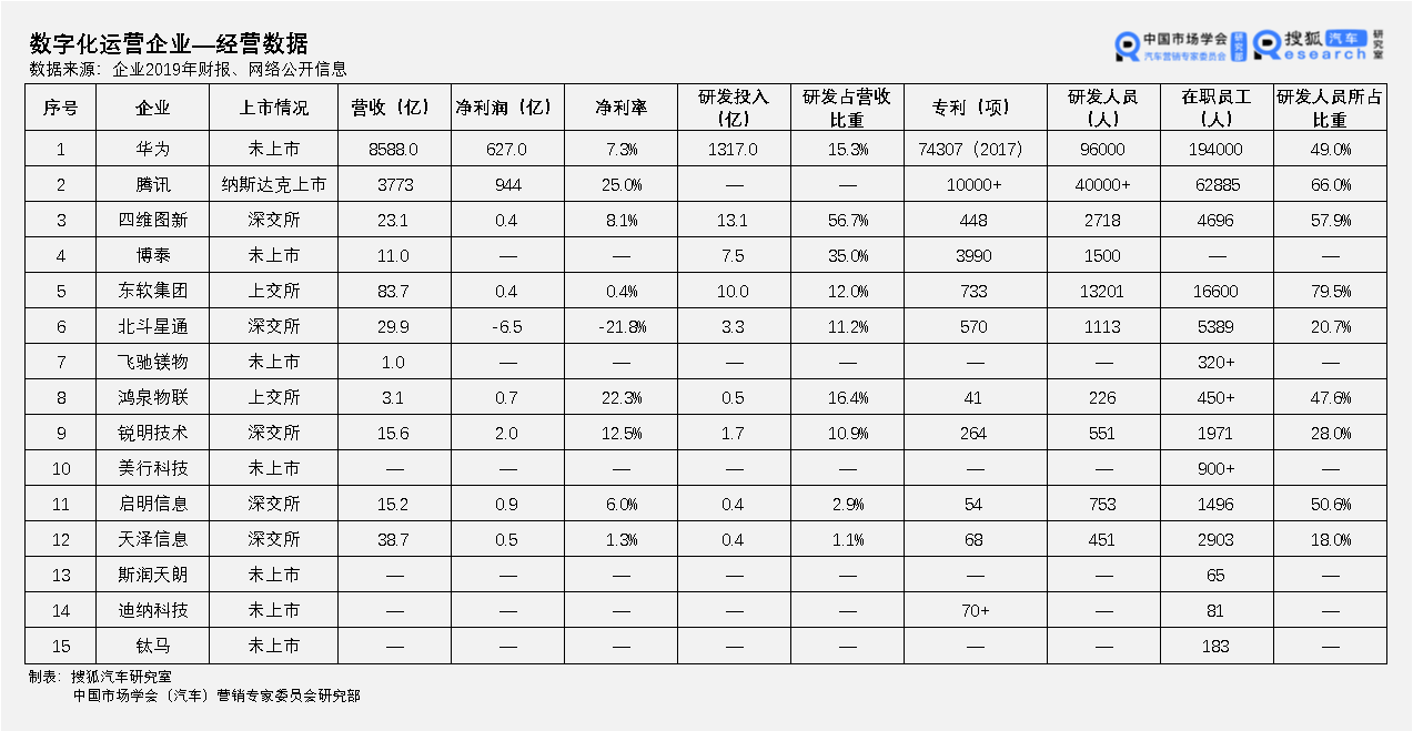 从榜单中可以看出,这一赛道上,既有传统车联网服务商、图商,也有新兴的互联网跨界公司、汽车电子供应商、安全公司,市场角色多样,业务种类也较为多元。市场规模和业务体量靠前的为互联网和汽车科技巨头。 从企业业务布局来看,定制化的车机操作系统和特色应用开发是互联网企业进入车联网的重点布局方向,个性化的人机交互、手机互联、OTA等不断丰富着智能座舱的功能体验,车联网安全逐渐获得行业重视,车机车联网和手机车联网逐渐走向融合。 导航地图、定位服务等传统车载信息服务领域存在资质门槛,市场格局稳定,百度、高德、四维图新主要为行业内的主要服务供应商。 随着车机系统和在线娱乐的发展,车企和车联网公司力图突破“再豪华的汽车也逃不掉被手机支架支配的恐惧”,车载影音娱乐也实现了由“导航+CD+FM”向“车机大屏+操作系统+应用生态”的转变。 硬件层面,四维图新、博泰、东软集团、北斗星通、索菱股份在前装的数字仪表、车机大屏、T-BOX、OBU和后装的流媒体后视镜、行车记录仪等车载智能终端市场取得良好的发展。 软件层面,腾讯、百度、斑马网络(阿里巴巴与上汽集团合资公司)、华为、博泰纷纷布局车载操作系统和应用生态的打造。 其中斑马网络的AliOS基于Android系统进行深度优化,实现对车机操作系统内核、硬件驱动、系统服务等底层内容的重构,在上汽数十万量产车型的应用中表现突出。 腾讯、百度的车机操作系统多在应用层调用已有的车辆服务接口,形成集智能导航、语音交互、云服务等功能的“超级App”。腾讯的TAI 3.0生态车联网解决方案和“腾讯小场景”持续丰富着车内互联网应用生态,百度Carlife+在超过400款车型上实现车机、手机的互联映射。 华为通过“麒麟+鸿蒙OS+ HiCar”赋能数字座舱,实现智能汽车与智能手机在硬件、软件和应用生态等全产业链的无缝共享。HUAWEI HiCar生态合作伙伴超过30家车厂,合作车型超过120款。 汽车应用生态的发展和“软件定义汽车”使得汽车OTA车联网的核心业务,得到整车企业和车联网服务商的高度重视。OTA领域,百度、腾讯、四维图新等为配套车机提供自身业务相关的软件升级服务,艾拉比、东软集团深入汽车控制域,作为第三方为车企提供车机和ECU的软件、固件升级服务。 信息安全是车联网能够健康发展的重要保障。车联网安全领域,百度、腾讯均已成立车联网安全团队,从事车联网安全攻防研究;360智能网联安全实验室推出“汽车安全大脑”为车企提供软硬件信息安全防护,并筹备发起“中国车联网安全联盟”。 在以上细分领域之外,博泰、美行科技作为车联网综合服务商,致力于面向整车企业提供完整的软硬件解决方案。 博泰是国内最大的车联网综合服务商,在中国车联网市场拥有全套运营资质,服务国内外超过31家整车企业,拥有133家生态合作伙伴;美行科技致力于为车企提供场景化出行服务,在车载导航市场超过1500万台装配量。 从企业经营状况来看,车载信息服务企业中,腾讯、百度两大互联网巨头凭借规模优势,拥有大量的资金和人员投入技术研发和产品布局,将保持长期领先优势。 博泰车联网、四维图新、东软集团做为头部汽车技术服务商,盈利状况较好,均达到数十亿人民币,但净利率最高仅为个位数,整体有待提高。这些企业对研发人员、研发经费上投入较高,专利积累较为显著。 博泰车联网CEO应宜伦曾表示,1万人的研发团队加上50亿的研发费用是较为理想的研发阵容,但单靠车联网公司或者主机厂都很难实现,未来联合研发,抱团发展是必然趋势。 美行科技、艾拉比、360安全、斑马网络、高德相关经营数据尚不得知,但在车联网信息服务的繁荣下,相关业务必将迎来快速增长,未来增长潜力巨大。 03 数字化运营赛道 车联网数字化运营是以车载智能终端、车载软件为入口,车联网云平台、大数据平台为核心资产,实现对移动出行、汽车后市场、以及物流、客车、出租等垂直行业应用的数字化“再造”,大幅提升生产、运营、服务效率,具备巨大的市场空间。 埃森哲大中华区主席朱伟表示:“互联、无人驾驶、共享和电动化四大趋势相互融合,将为中国消费出行市场带来深刻的变革。若要保持竞争力,汽车企业必须利用智能联网、移动出行等数字服务重塑产品和商业模式。” 数字化运营赛道上重点企业竞争排名情况如下: