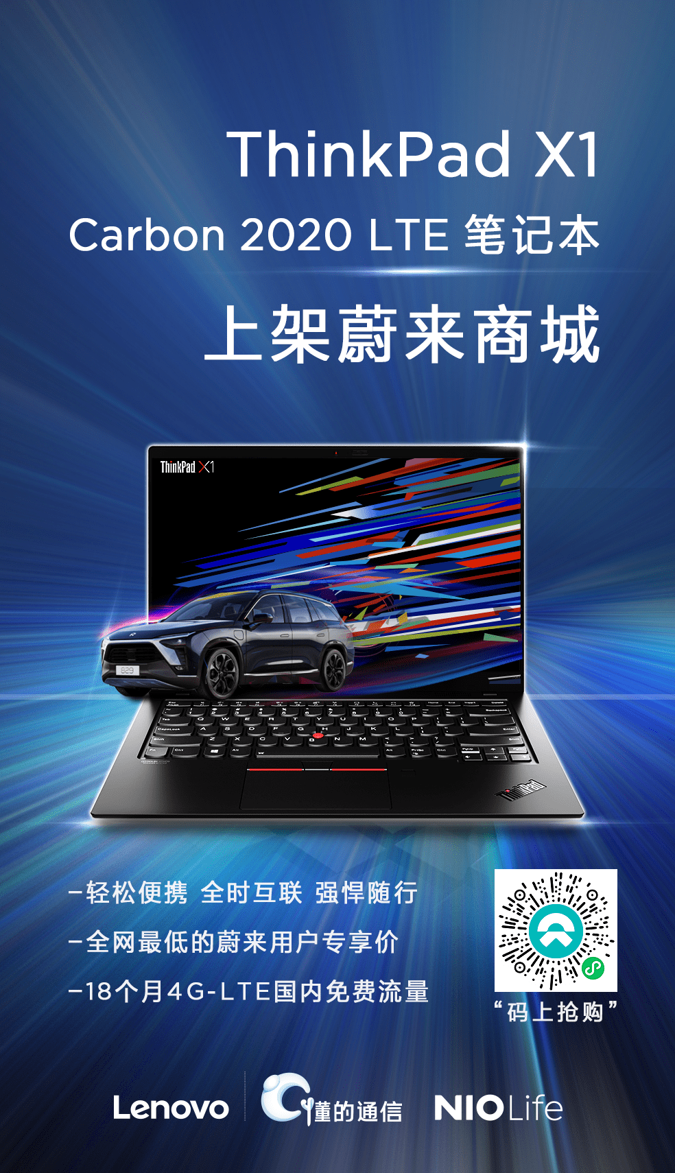 汽车与笔记本跨界合作,将会产生怎样的火花?日前,联想ThinkPad X1 Carbon 2020 LTE全时互联笔记本上架蔚来商城NIO Life!联想为蔚来车主用户提供全网最低的专享价和18个月国内免费流量,每个月15GB,达量限速不断网。