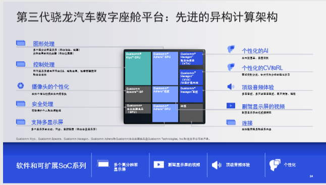 所有这些体验都离不开高通在内的各大厂商提供的数字座舱解决方案,尤其是现在汽车制造商和一级供应商都在超宽显示屏、多显示屏、多摄像头以及音箱方面加大研发投入。 目前,高通已经发布了三代数字座舱平台,早在2014年我们就推出了第一代数字座舱平台;2016年和2019年我们又陆续推出了第二代、第三代数字座舱平台。 据雷锋网了解,高通推出的第三代骁龙汽车数字座舱平台分为了至尊级、旗舰级和性能级三个层级的不同的硬件平台。第三代骁龙汽车数字座舱有以下几个特点: 可以提供支持驾乘人员的个性化设置,实现车内的自然语音控制、虚拟助理,同时对人机界面可以进行自适应交互等; 提供更智能的导航,包括视觉辅助定位以及车道级GNSS导航和基于增强现实(AR)的导航系统。值得注意的是,第三代数字座舱在软件的统一平台上也提供了包括对Android、Linux、QNX RTOS的系统适配。 在此基础上,未来骁龙汽车数字座舱平台还有望支持更加个性化的体验。 高通最后透露,目前全球有19家主流汽车制造 总之,高通正加速拓展它的疆界,但挑战也是越来越大。对于高通来说,进一步深入到自动驾驶市场,从而和这个领域的另外两个厂商——英特尔和英伟达展开竞争。 雷锋网 雷锋网雷锋网 |
