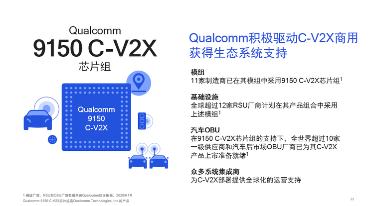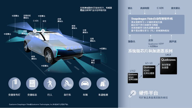 杀入自动驾驶领域,高通的野心有多大? 作为国际芯片巨头及全球最大的智能手机芯片制造商,高通其实一直都有布局汽车领域,也是主要的汽车供应商之一。 目前,高通汽车业务主要专注于四大领域: 数字座舱,面向信息影音和仪表盘、乘客和后排娱乐系统、驾乘人员的监测,还包括虚拟化和一体化RTOS/OS。 车载网联以及C-V2X,覆盖车内蓝牙/Wi-Fi连接技术、高精定位、4G/5G连接技术等。 ADAS与自动驾驶,我们推出了能够支持L4/L5级自动驾驶的软硬件解决方案,我们还围绕解决方案提供安全软件平台、HIL/SIL工具链。 云侧终端管理,智能网联汽车需要实时跟云端连接,通过OTA不断升级软硬件,通过与云端的连接传输数据,提供更好的服务和用户体验。 C-V2X的商用高通技术标准高级总监李俨认为智慧交通系统有三个基础技术支撑:基于5G的连接技术、基于AI的自动化技术,以及C-V2X技术。 在业界,通常把C-V2X比喻为车的“朋友圈”,通过端到端的直接连接方式,把车和周边的道路参与者相互连通,使车能够对道路参与者进行及时的感知,对整个道路中其它参与者的意图进行了解,合理地进行路径规划,从而避免事故的发生。 目前,业界普遍认为中国会成为C-V2X技术的领跑者,在过去一段时间,国内的很多地区,例如天津、无锡、重庆、武汉,都有大量的车联网建设项目。通过路边基础设施的不断改造,很多地区已经开始提供LTE V2X的覆盖,同时也有许多汽车厂商宣布在今年年底或明年年初陆续量产支持C-V2X的汽车。