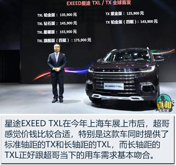 厥后,跟着本身安家立业,那台老旗云也在逐步变老,尤为是去年我妻子生了孩子以后,家里愈加急迫地必要一台更别致、更进步前辈、更年夜气的车来接替老旗云的事情。 凑巧在这个时辰,星途EXEED TXL在本年上海车展时代上市了。我一看这车引导价12.59-17.59万元,感受比力符合,出格是这款车同时提供了尺度轴距的TX(参数|图片)以及长轴距的TXL,而长轴距的TXL正好跟我当下的用车需求根本吻合。 再斟酌到星途EXEED是奇瑞推出的全新高端自立品牌,我作为一个奇瑞的老车主,很想知道这个基于奇瑞全新高端自立品牌的新车型事实有甚么值患上入手的亮点?因而就决议去4S店先看看车,不外厥后连我本身都感受很不测的是,在4S店看完车并试驾了一下星途EXEED TXL以后,我没有颠末太多的夷由,就交钱订车了。