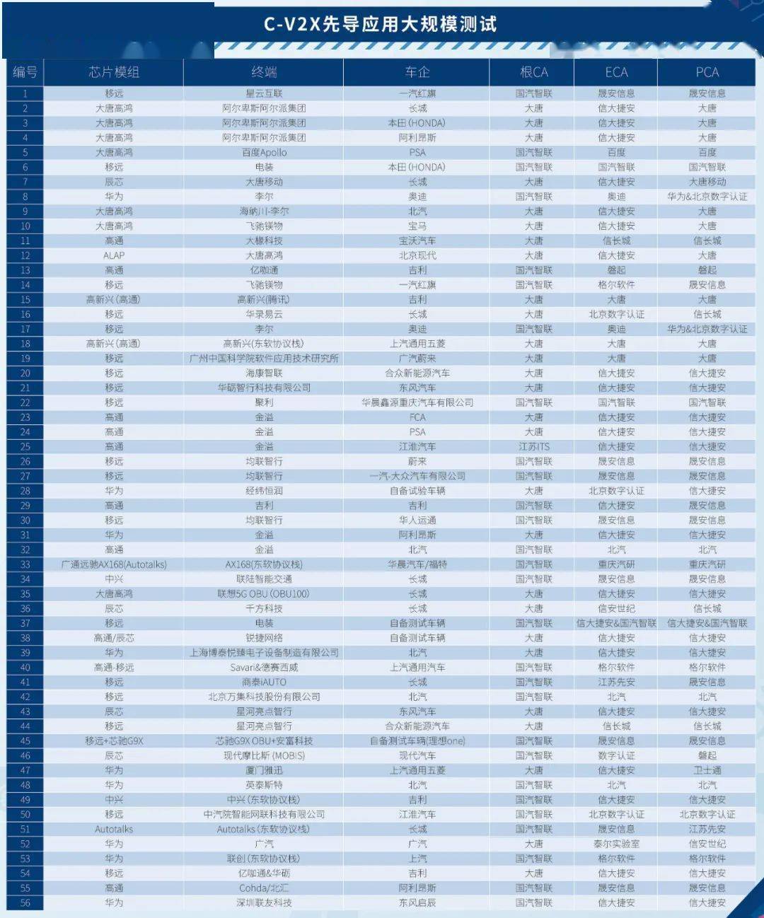 参与C-V2X大规模测试厂商一览表 (点击查看大图) 测试现场由180台背景车OBU车载单元和一台RSU路侧设备构成大规模终端测试环境,能够模拟真实道路环境下大规模车辆密集通信场景,涉及车与车、车与路、车与人多种场景下的C-V2X 通信性能测试项目和 功能测试项目,实现了跨整车、跨终端、跨芯片模组、跨数字安全认证的C-V2X全产业链环节的协同。