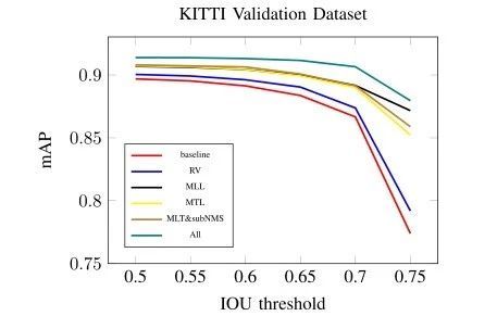 图 6.在 KITTI 验证集上的分歧 IOU 阈值下的 AP 曲线 表 1