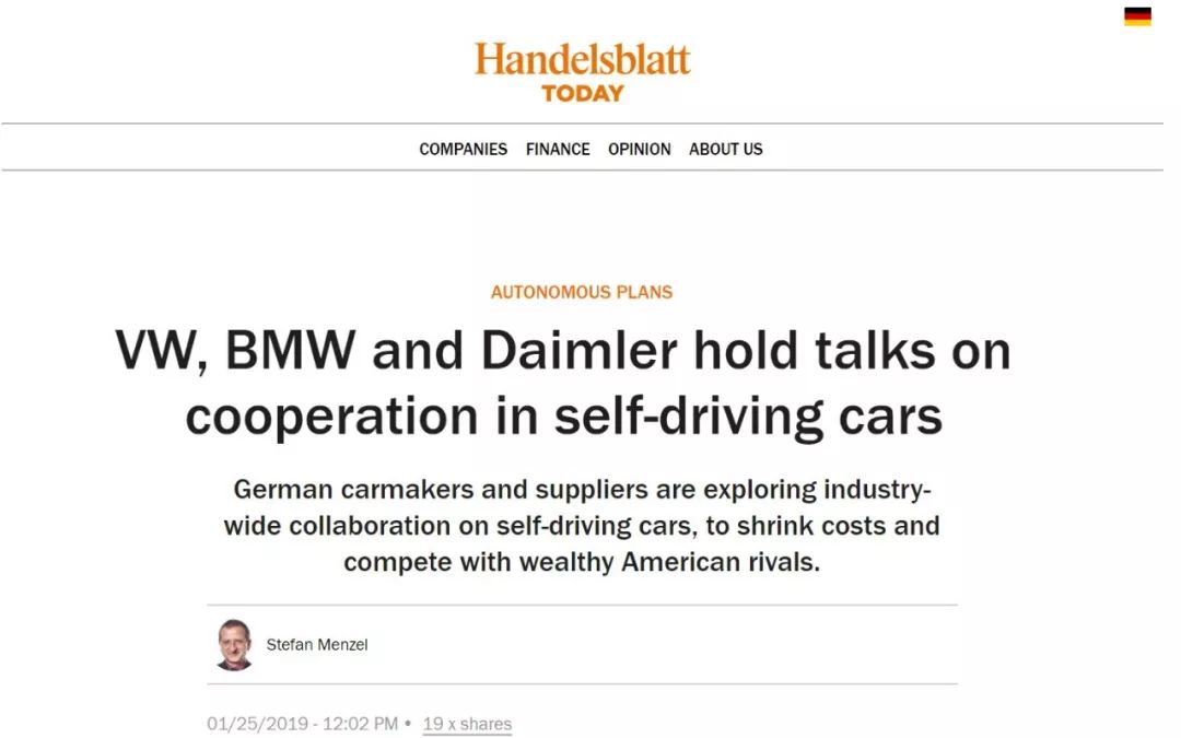 整车厂、Tier 一、软件及计较平台供给商,尽管奔跑同盟的成员没有宝马同盟分工加倍细化,但每一一家都是各自领域的世界级玩家。可以说,奔跑同盟是另外一个顶级主动驾驶同盟。 拆解同盟不丢脸出,宝马以及奔跑是直接竞争敌手;年夜陆、德尔福以及博世是直接竞争敌手;Intel-Mobileye 以及英伟达是直接竞争敌手。这也就象征着,当同盟逐渐成型的时辰,两年夜同盟成了综合能力完整、全方位匹敌的竞争敌手。 站在一年前的今天,计议奔跑以及宝马在主动驾驶领域互助的可能性无异于天方夜谭。那末,一年后的今天,剧情为什么急转直下,宝马以及奔跑又是若何走到一块儿的呢? 2019 年 1 月 25 日,德媒 Handelsblatt 曝出,年夜众、奔跑以及宝马正在就主动驾驶领域的互助开展会商。那篇文章的子题目是「德国汽车制造商以及供给商正在索求全行业的主动驾驶汽车互助,以摊销本钱并与实力雄厚的美国竞争敌手开展竞争。」