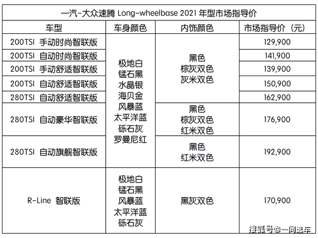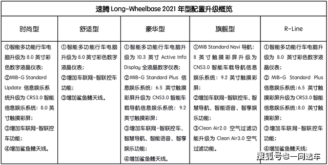 11月17日,A+级三厢车的市场冠军速腾,迎来了2021年型的超级进化上市。售价区间12.99-19.29万元。 在保持现款车型强大产品力的基础上,新车从入门级车型起,便新增8.0英寸彩色数字液晶仪表、CRS3.0智能信息娱乐系统、车联网-智联控车功能、鲨鱼鳍天线;豪华车型则将智能多功能行车电脑升级为 10.3 英寸 Active Info Display 全液晶数字仪表,新增含智联控车、智慧导航、智能语音、智享娱乐功能的车联网。在此基础上,旗舰车型更增加了Clean Air3.0 空气过滤功能。