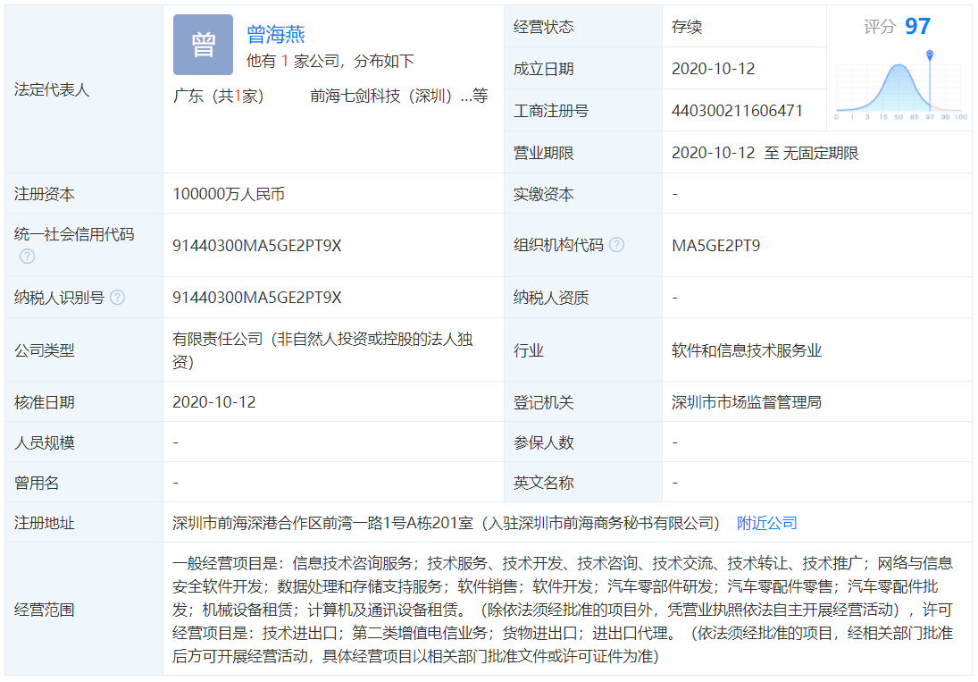 继旗下首个自建整车制造基地西安工厂建成后,宝能汽车又有新动作。11月16日,宝能汽车宣布正式成立汽车软件公司——前海七剑科技(深圳)有限公司,致力于成为全球领先的智能汽车软件及创新业务模式提供商。 据天眼查显示,前海七剑科技(深圳)有限公司成立于今年10月,注册资本10亿元,由宝能汽车集团有限公司全资控股,经营范围含信息技术咨询服务;网络与信息安全软件开发;数据处理和存储支持服务;软件销售;软件开发;汽车零部件研发等。