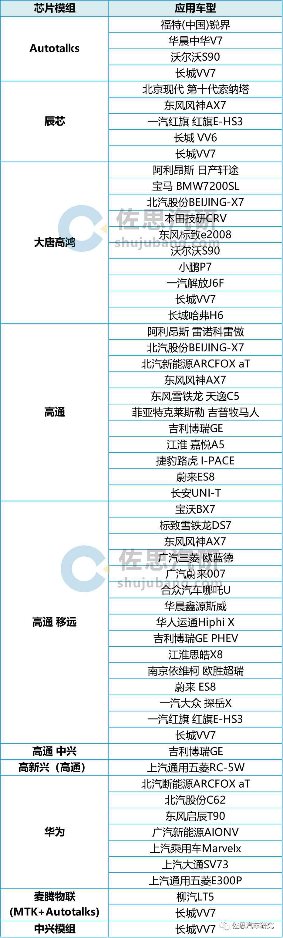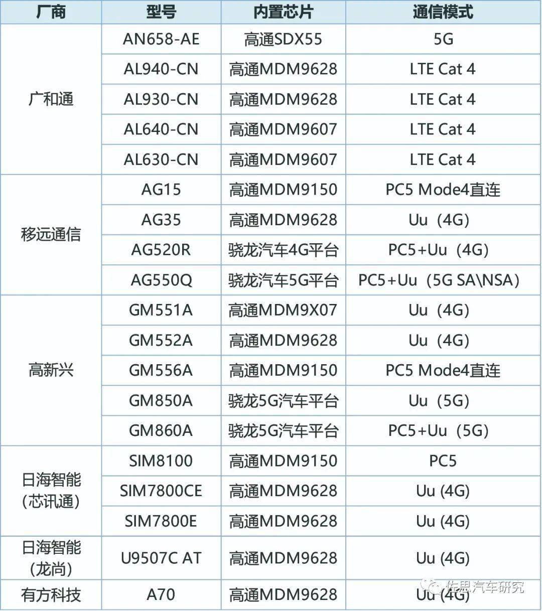 来源:各公司官网、公开资料 2020年V2X“新四跨”演示车队搭载芯片模组情况