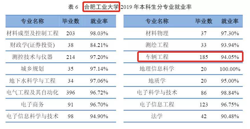 在工业和信息化部与国家标准委联合印发《国家车联网产业标准体系建设指南(总体要求)》,工业和信息化部科技司副司长王卫明指出,车联网产业是汽车、电子、信息通信、道路交通运输等行业深度融合的新型产业,是全球创新热点和未来发展的制高点。大力发展车联网,有利于促进汽车产业创新发展,构建汽车和交通服务新模式新业态。 车辆工程专业就业前景 “车联网”时代下,车辆工程专业毕业生的就业方向也多元化,从汽车生产流程中的调研、设计、试验到销售环节,都可以选择。比较理想的,可以到各种车辆研究所,汽车、机车车辆、地铁及轻轨车辆的设计制造企业,参与城市交通系统的规划、设计、建设、运营和管理等工作。近几年,车辆工程专业本科就业率在90%-95%之间! 下图是合肥工业大学2019年车辆工程专业本科毕业生的就业率: