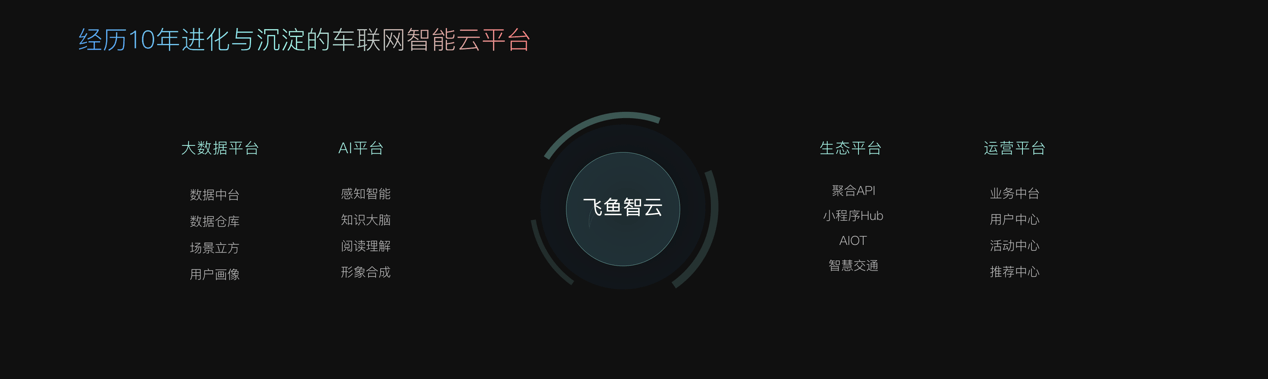 科大讯飞智能汽车事业部飞鱼智能助理产品总监邢猛介绍称,语音识别是人车交互的起点,飞鱼助理运用了声源定位和声纹识别技术,并结合环境、回声消除和成熟的麦克风阵列降噪方案,能够实现极高准确率的语音识别。同时,多语种+方言语料的覆盖,已在红旗 同时,飞鱼助理独特的声音复刻功能,具备语料库拼接、深度学习、音色转换等一系列技术的加持,只需将用户的音频部署到云端并进行下载,就可以实现用户钟意声音的语音播报。 此外,飞鱼助理创新性的加入了面向全场景多业务的多模识别技术,可以通过视线追踪和唇语检测等自动判定用户意图并提供服务。当用户在驾驶时出现疲劳或者分心的状态时,也能够及时进行语音提醒,有效保证驾驶安全。 飞鱼助理还打通了多模输入到多模输出的链条,人车交互最终会以形象复刻、口型同步、动效展示、氛围灯律动等更具有科技感的方式呈现。 目前,飞鱼助理已经搭建了灵活的定制平台,形成了完整的自定义解决方案,讯飞可以提供定制分析工具,为客户快速定制铺路搭桥,汽车、商用车、甚至电动车都可以定制应用。 飞鱼智云1.0:汽车全链路服务的数智化平台解决方案 飞鱼智云至今已发展了10年,不仅引用了新技术,如云原生、微服务等,同时也自研了一套大数据、知识图谱等核心平台,进而支撑车联网产品和服务持续的创新。 飞鱼智云1.0是飞鱼智云核心平台和服务进行产品化和商业化的产物。其主要包含了大数据、AI和业务中台,以及智能化云应用,如场景立方、汽车知识大脑、用户画像等。