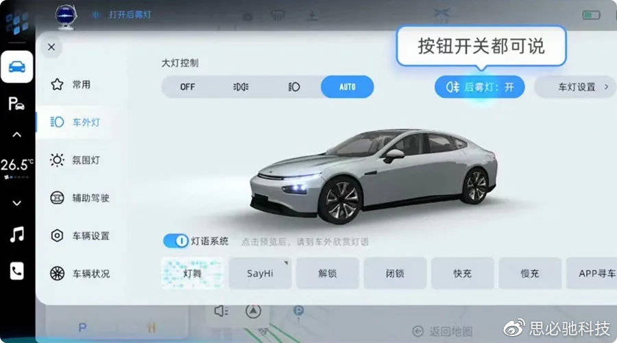 以地图设置页面为例,唤醒小P后可直接说“取消避免拥堵”即可更改路线偏好。 音乐界面上的功能也都可以直接说。例如:唤醒小P后可直接说“换一批”即可更换推荐内容。 应用内的菜单项也同样支持语音直接操作。以车辆控制为例,如需切换页面,在唤醒小P后直接说“切换到车辆状态页面”即可。 后续将支持更多自研应用,让车主不需要刻意记住每条指令,实现看图说话。 · 语义打断 “你好小P,今天天气怎么样” ---“广州市今天大雨转中雨,气温24-29...” "最近有违章记录吗" ---“当前暂未查询到违章信息,请稍后查询”