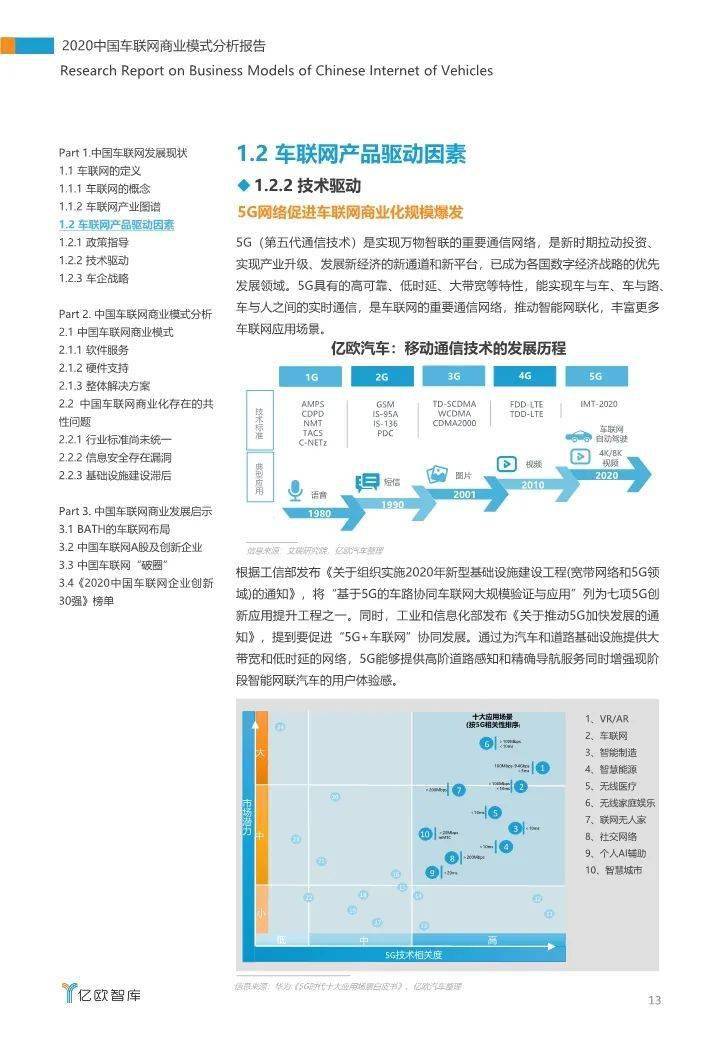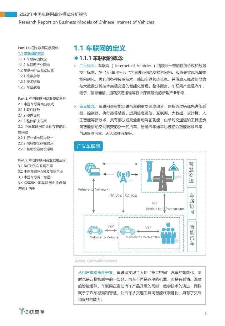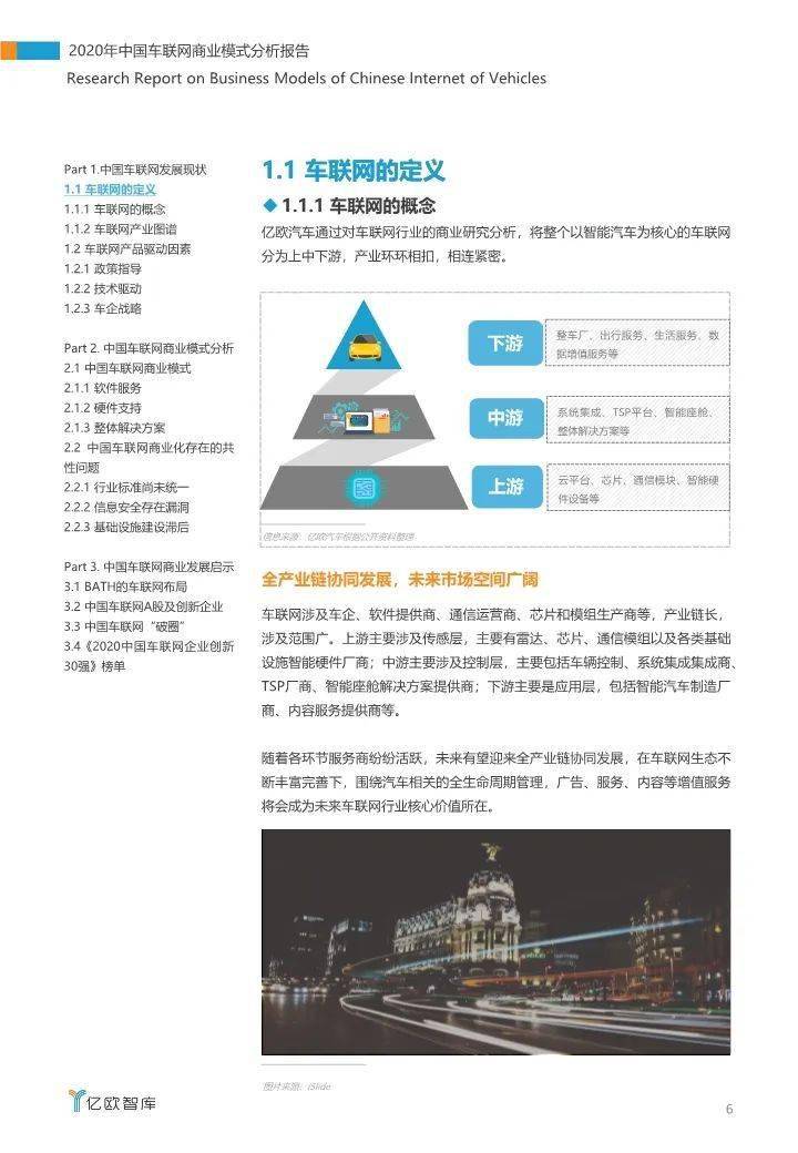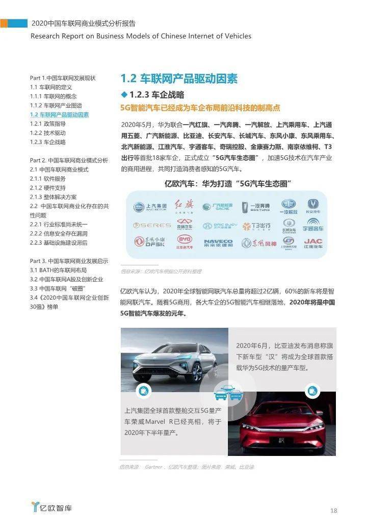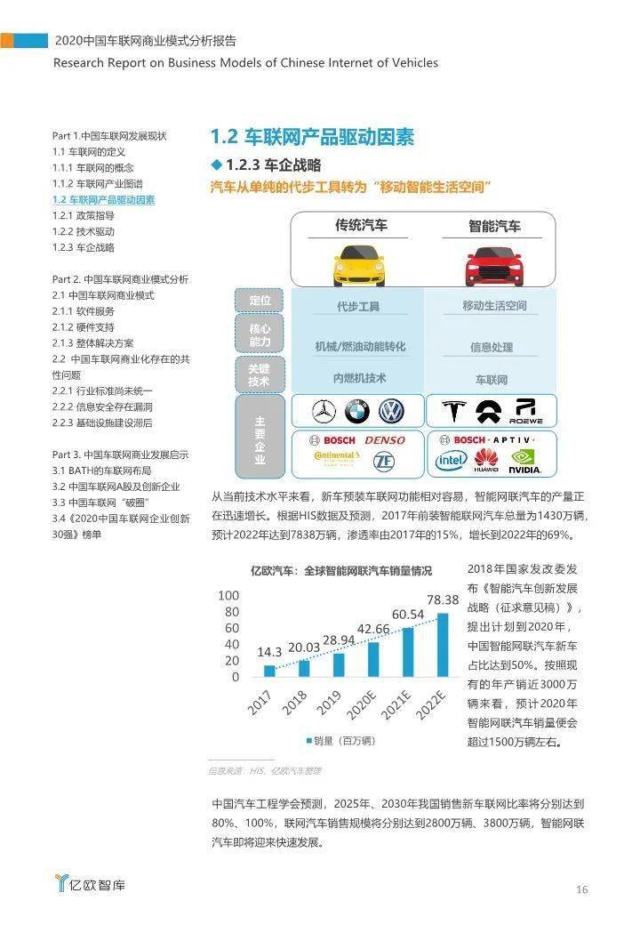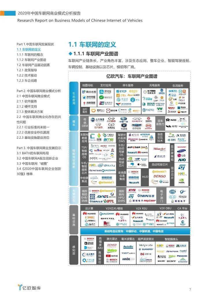 2020年全球车市“寒冬”之下,中国车联网产业正在孕育新一轮生机。随着汽车智能化、网联化、电动化的进程加速,百年传统汽车产业迎来了大变革,“软件定义汽车”的时代已经悄然来临 。 车联网作为信息化与工业化深度融合的重要领域,是5G垂直应用落地的重点方向,未来具有巨大的产业发展潜力和应用市场空间,对于带动传统汽车行业、交通行业和电子信息行业的产业转型升级 、系统创新和融合发展具有深远的意义 。 作为传统汽车升级成智能网联汽车的关键,近年来,车联网产业引来了无数传统企业、互联网企业以及创新企业入局,共同围绕“新技术、新理念、新模式”,打造新一代的智能汽车。 在中国5G商用的关键节点之上,亿欧汽车围绕以“智能汽车”为核心的车联网产业链展开梳理和分析,理清当下中国车联网企业的创新和短板,探究车联网可持续发展的新型商业模式,共同促进产业实现良性发展。