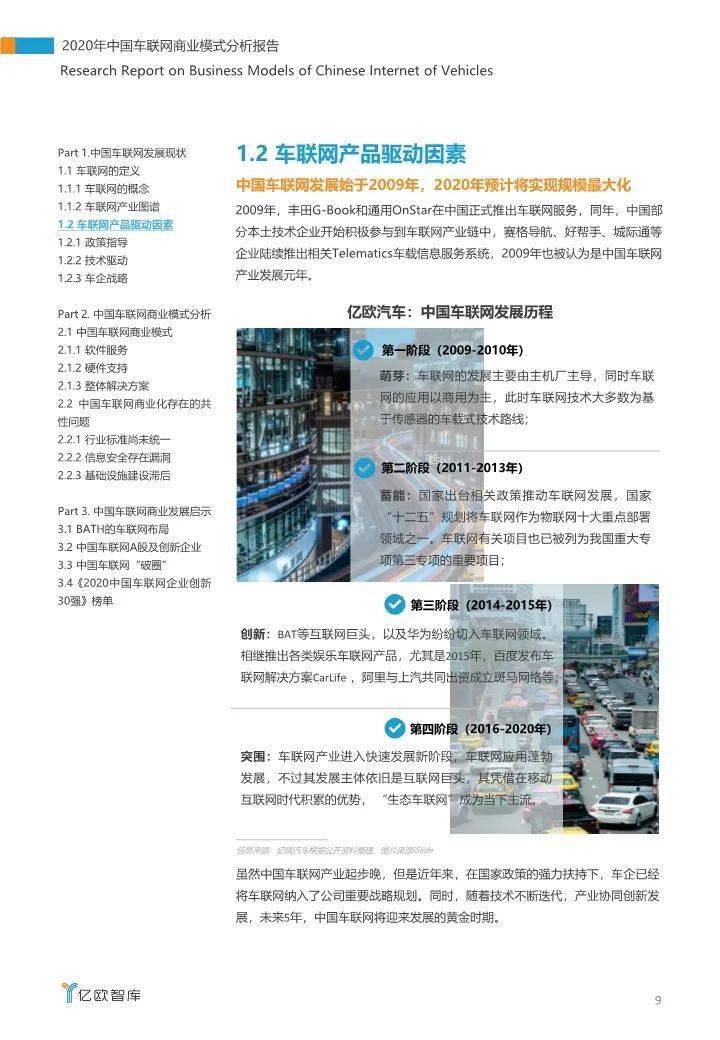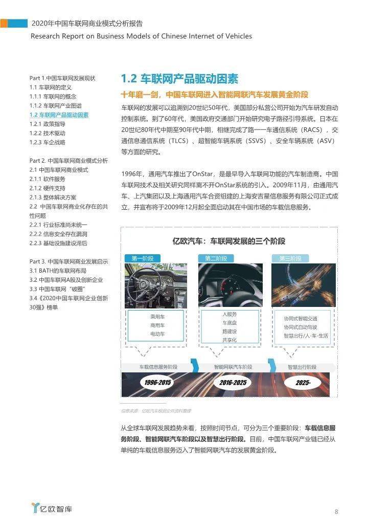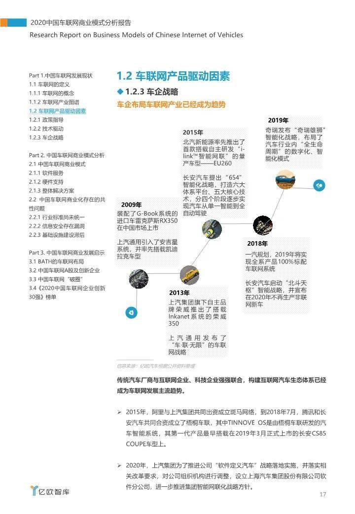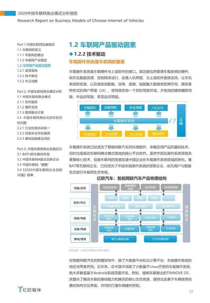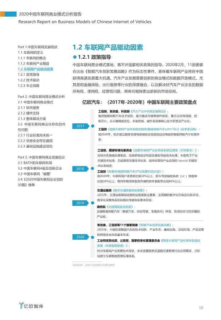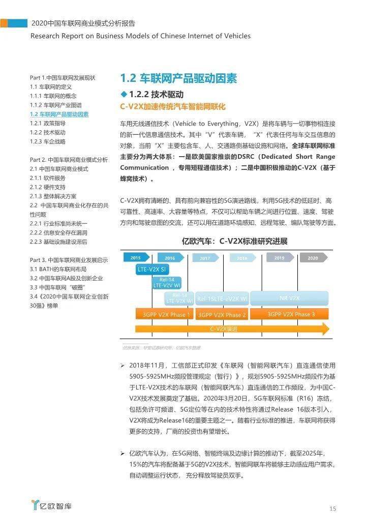 2020年全球车市“寒冬”之下,中国车联网产业正在孕育新一轮生机。随着汽车智能化、网联化、电动化的进程加速,百年传统汽车产业迎来了大变革,“软件定义汽车”的时代已经悄然来临 。 车联网作为信息化与工业化深度融合的重要领域,是5G垂直应用落地的重点方向,未来具有巨大的产业发展潜力和应用市场空间,对于带动传统汽车行业、交通行业和电子信息行业的产业转型升级 、系统创新和融合发展具有深远的意义 。 作为传统汽车升级成智能网联汽车的关键,近年来,车联网产业引来了无数传统企业、互联网企业以及创新企业入局,共同围绕“新技术、新理念、新模式”,打造新一代的智能汽车。 在中国5G商用的关键节点之上,亿欧汽车围绕以“智能汽车”为核心的车联网产业链展开梳理和分析,理清当下中国车联网企业的创新和短板,探究车联网可持续发展的新型商业模式,共同促进产业实现良性发展。