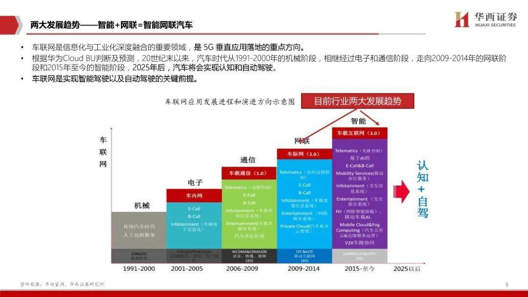 ◆根据华为Cloud BU判断及预测,20世纪末以来,汽车时代从1991-2000年的机械阶段,相继经过电子和通信阶段,走向2009-2014年的网联阶段和2015年至今的智能阶段,2025年后,汽车将会实现认知和自动驾驶。