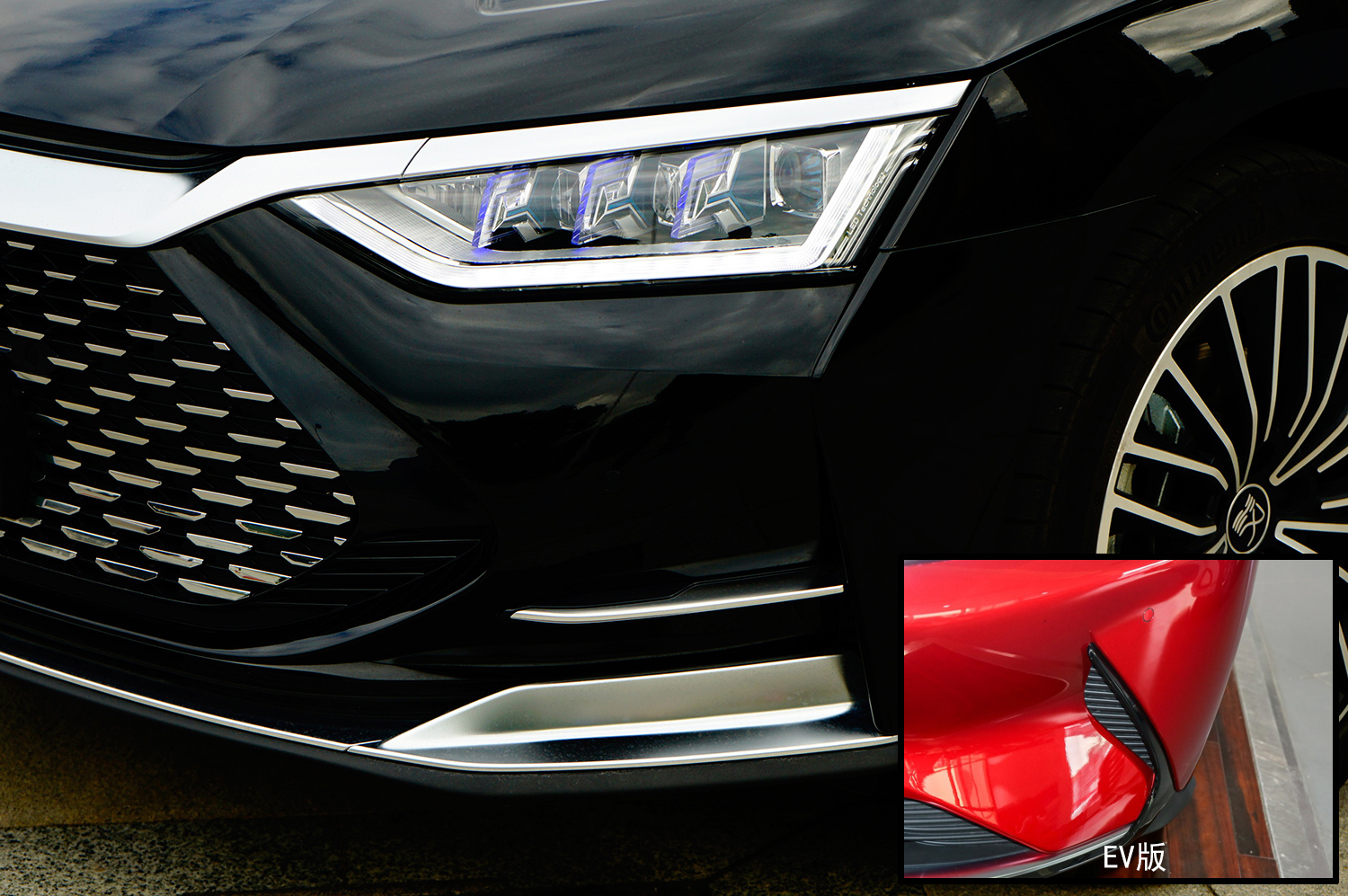 大灯造型并没有EV版那样细长,有一定的厚度,但弯折的线条显得铿锵有力,内部采用矩阵式布局,加入蓝色元素体现新能源身份,“龙须”LED日行灯兼具智能氛围灯的功能,灯组在车辆解锁时能够随车标一同亮起,犹如神龙觉醒,仪式感爆棚。侧腮部采用导风口造型,但其实并未打通,用银色装饰提升精致度。