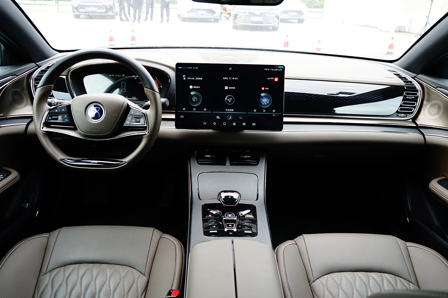 车厢内,整套内饰不仅有设计感,而且用料与配色都提出高档感,不愧来自前奔驰设计师米开勒·帕加内蒂之手。中控台与车门有着细腻的衔接,两侧向前延伸的出风口营造出良好的纵深感,而车门板上的喇叭造型做出很漂亮的内凹状,组合在一起尤其自然,让车厢的整体感尤其强烈。此外,车厢采用浅米色皮质、浅灰色实木和黑色钢琴烤漆组合,无论颜色还是材料,都有着豪华车的品质感。
