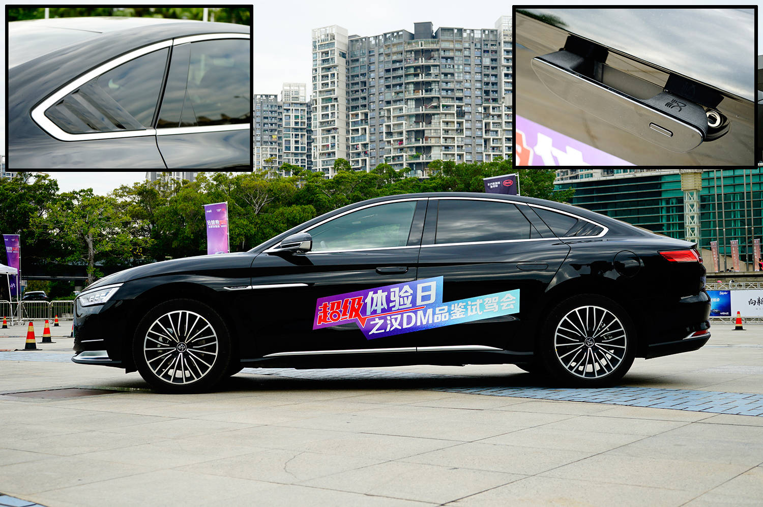 侧面来看,整体姿态显得低趴、流畅,从概念的双门跑车到量产的四门轿跑,尺寸有所增加,但动感造型的精髓得到保留。流畅的车顶弧线塑造出溜背造型,鲜明的腰线从前翼子板下滑延伸至后门把手,在C柱和D柱部分车厢内收,营造出外抛的车肩,有高档车的味道。车身有细节两处是我们比较喜欢的,一是后三角窗处类似鲨鱼鳃的立体装饰件;二是隐藏式门把手,可以提升仪式感和空气动力学性能,上方还刻有“汉”的中文标识,细节处理得很到位。