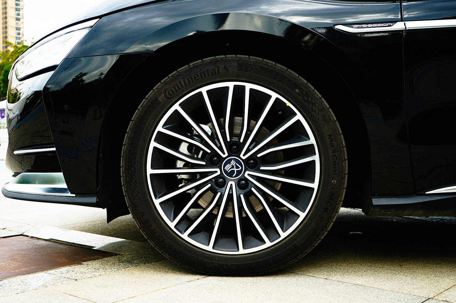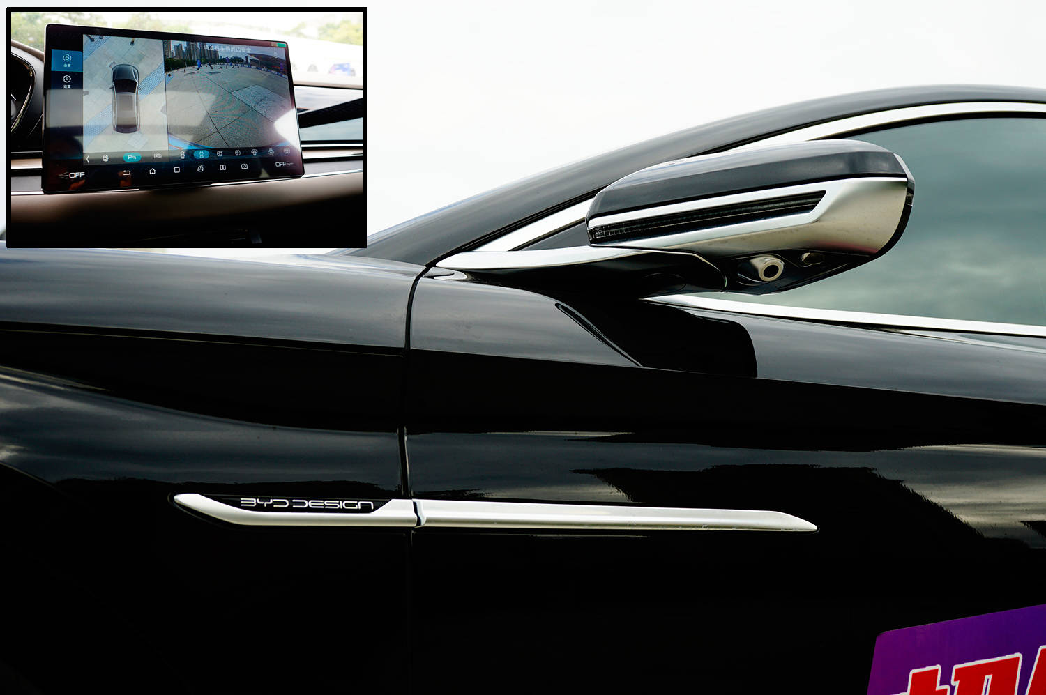 外后视镜采用黑银双色拼接,扁平的造型降低风阻,银色托架显得颇有档次。设有LED侧转灯和侧置摄像头,支持360°全景影像功能,还具备电动调节、折叠、记忆、加热、倒车自动下翻和锁车自动折叠功能。翼子板增加了提升档次感的飞翼式镀铬条,标注有“BYD DESIGN”,展示出自主设计的信心。