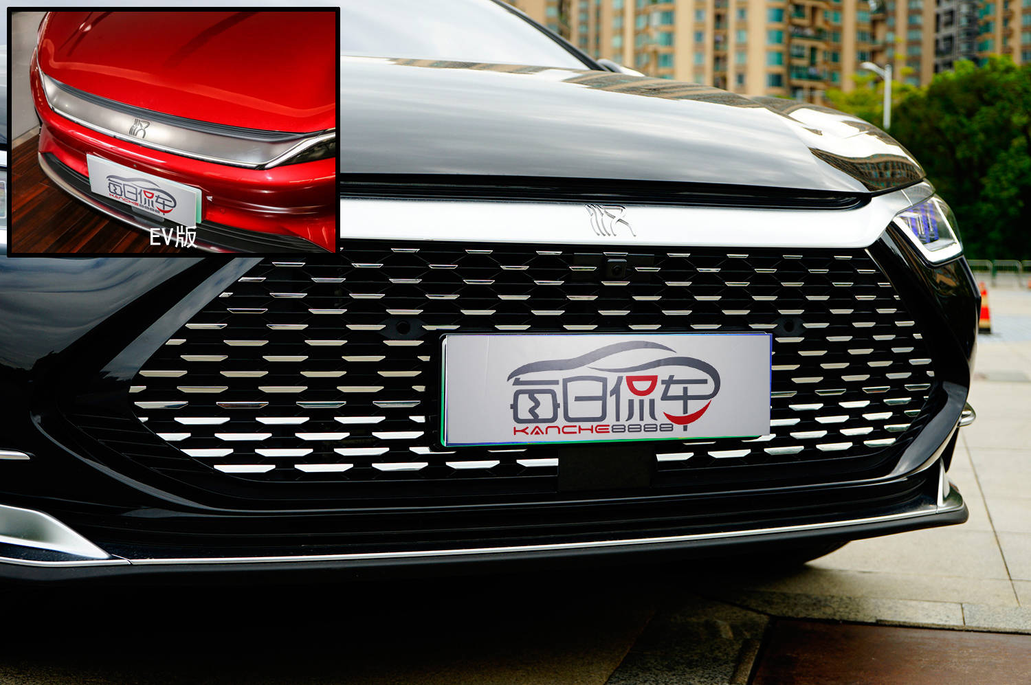 汉DM采用家族“Dragon Face”龙鳞格栅,大尺寸六边形中网加入了丰富镀铬条装饰,细看来,镀铬条下方的长、上方的短,营造出透视立体效果。格栅装饰的车头看起来比EV版封闭前脸要高,但其实两者的高度并无差异。牌照下方标配有全速自适应巡航的毫米波雷达模块。