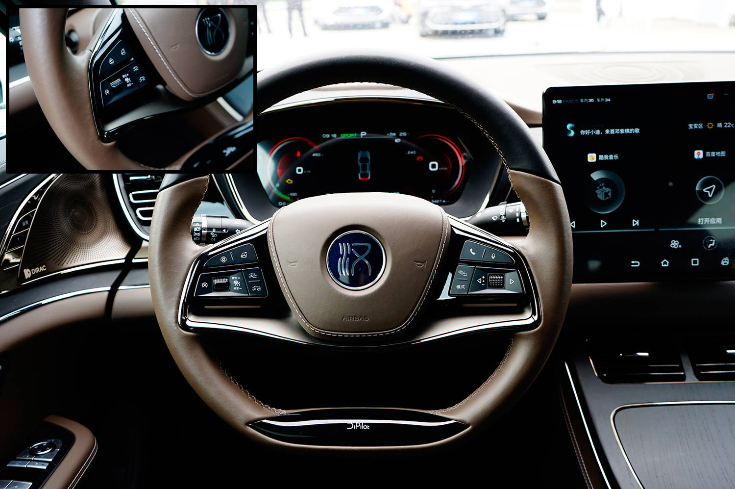 方向盘采用了双辐造型,全系标配真皮包裹,双色皮面拼接显然会增加成本,皮质的手感很舒适,方向盘的尺寸也很合适,下方亮黑饰条标注着DiPilot字样,凸显技术派的印记。横辐左侧设有自适应巡航控制键,右侧是多媒体控制,采用比亚迪一贯中文标识值得肯定,如果两侧滚轮做得再精致些就更匹配了。