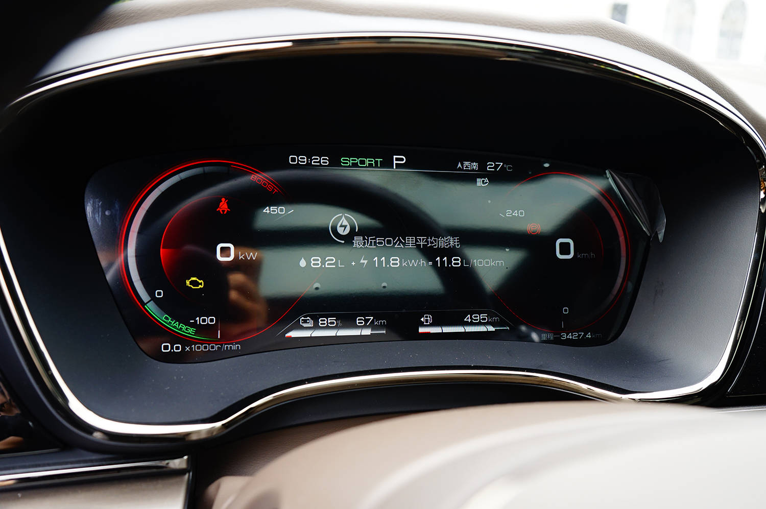 尾厢容积暂并未公布,拥有足够的纵深和宽度,不过高度受车顶下压影响并不充足,目测只能容纳两个大号行李箱,长途旅行可能会有些不便。后排座椅不支持放倒,无法对空间拓展,尾厢与车厢之间设有取物通道。地板下方还有一层较薄的空间,放置了补胎液和充气泵,没有配置备胎。 动力与操控——纯电模式驾驶平顺 过弯稳定性高 电量管理更合理
