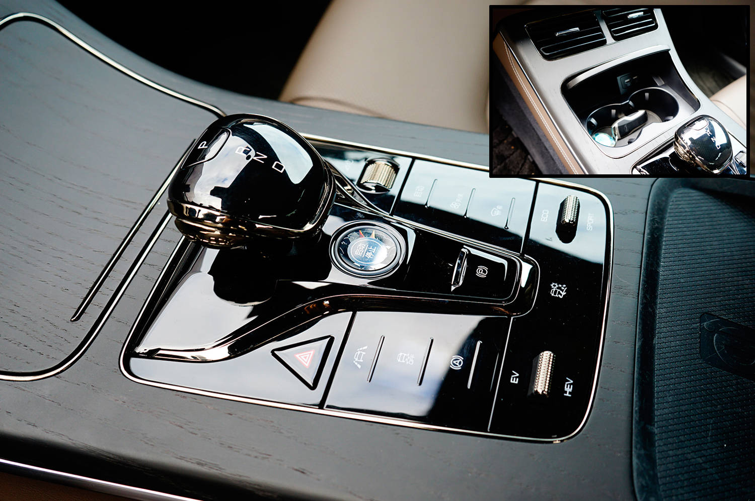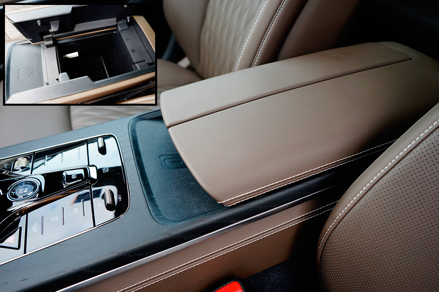 挡杆台采用了大面积的实木装饰,加上钢琴烤漆面板和镀铬点缀,营造出满满的高档感。亮面的电子挡杆造型小巧精致,顶置P挡节省空间也更顺手。后方众多按键采用触控按键,保证了整个面板的平面化,后方的驾驶模式采用拨杆控制,防止误操作。前方滑盖内置两个水杯架、手机储物板和两个USB接口,关闭时挡杆台显得尤为整洁。