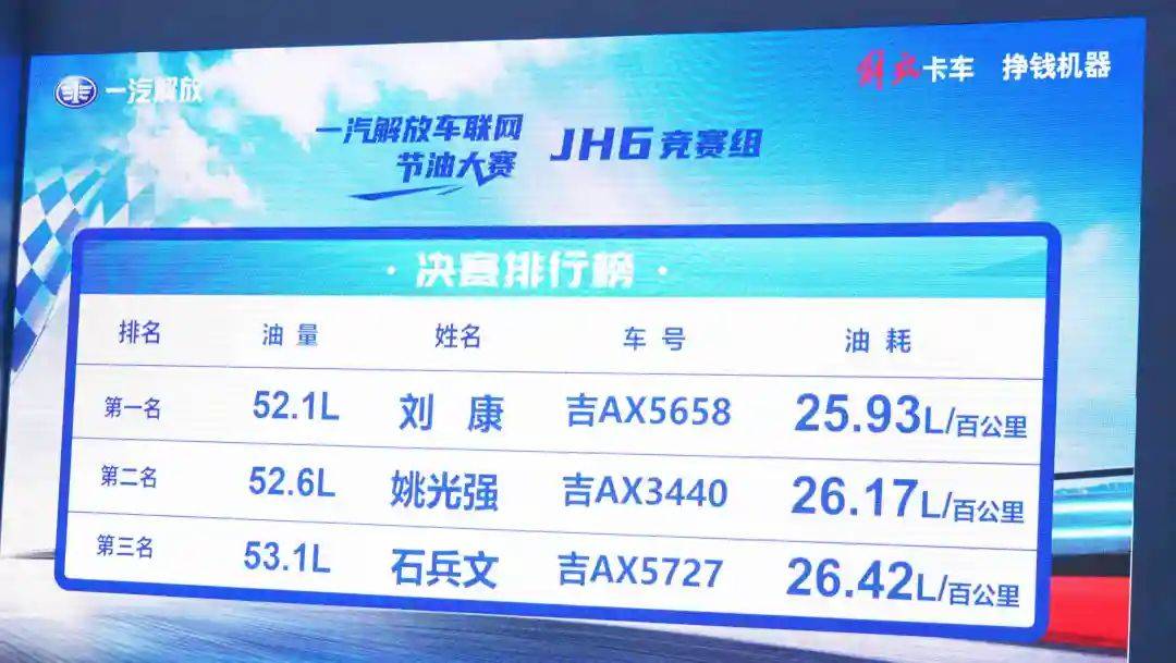 线下总决赛冠军奖品JH6 据统计,在长达七个月的赛程中,各参赛车辆的总行驶程达30亿公里,单车百公里平均油耗下降2.4L,共省油72,795,467L,共减少碳排放约195091.85吨,相当于7977.6亩森林一年吸收的二氧化碳,为更加绿色的自然环境做出了突出贡献。 以一场赛事带动一汽解放用户主动学习节油技巧,推动整个卡车行业用户在日常运营中纠正自身不当的驾驶行为,最终实现节油和低排放,一汽解放体现了共和国长子应有的社会担当。同样值得赞扬的是,通过举办互联网节油赛,一汽解放将天南海北的卡车人网聚在一起,分享经验、探讨生活,并为他们创造了展示自我的舞台,让他们感受到一汽解放对于卡友们的尊重与感恩。