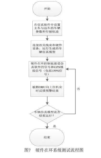 2 V2X硬件在环测试平台 OBU在装车前应进行完整的硬件在环测试,减少实车测试的成本和风险,硬件在环测试平台可以模拟不同的场景对OBU的软硬件进行全功能测试。 2.1 硬件在环测试系统 硬件在环测试 如图6所示,测试系统由工控机、机柜、硬件在环控制板、CAN通信设备(CANoe)、GNSS模拟器、车机显示屏和被测OBU组成。其中,工控机、CAN通信设备、硬件在环控制板和GNSS模拟器封装在机柜内,硬件在环控制板与V2X盒子为搭载完整定位、V2X应用及通讯功能的设备,工控机使用车辆仿真软件,如第1节所述的Simulink和Prescan搭建车辆模型与场景模型,模拟实时车辆数据、定位数据及RSU相关数据,并发送至硬件在控制板。该系统中,被测OBU作为主车触发并反馈预警信息,硬件在环测试板可同时作为多个远车及路侧单元RSU,与主车配合测试预警场景;被测OBU与硬件在环控制板通过PC5接口通信。作为主车的被测OBU接受来自GNSS模拟器发送的模拟GPS信号以仿真实车环境下的GPS环境,硬件在环控制板则直接通过PCIE获取车辆场景模型模拟的实时GPS信号。 注意到在V2X应用场景中,互相通信的V2X设备的时间必须同步,因此本文所述硬件在环测试系统中,被测OBU与硬件在环控制板均通过解析GNSS模拟器广播的定位信息获取1PPS信号从而达到时间同步。 同时,系统所用V2X设备均从CANoe获取车辆速度、加速度、航向角、方向盘转角等实时车辆数据(CAN信号)。硬件在环控制板可同时作为多个远车和RSU进行复杂场景模拟,因此可以方便地进行场景扩充及拓展。被测OBU计算的实时预警信息通过CAN总线发送给车机显示屏,以仿真真实的实车预警环境。