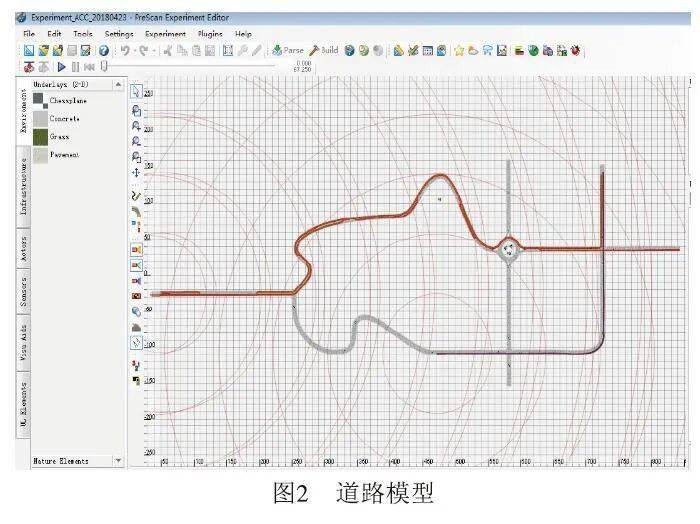 其中 C f 、C r 为前车轮、后车轮的侧偏刚度, ω(t) 为车辆绕Z轴的横摆角速度, m 为整车质量, I 为绕 Z 轴的转动惯量, V x 、V y (t) 为汽车沿车辆坐标系 X 轴和 Y 轴的速度, δ(t) 为前轮转角。 (2)道路模型 V2X仿真技术测试平台利用西门子公司的PreScan软件进行道路模型的搭建,道路模型 如图2所示,在仿真平台中可以搭建直道、弯道、十字交叉路口等不同道路模型。