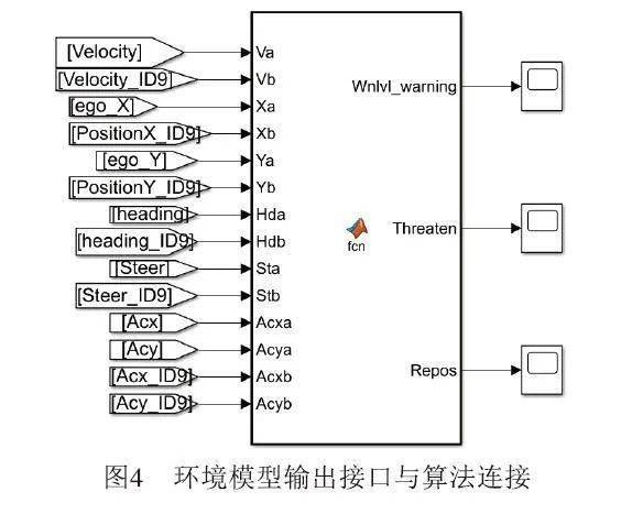 1.2 V2X算法导入 将车辆模型和道路模型在Simulink中进行导入并生成Simulink模块, 如图3所示,这些模块的输出将作为V2X算法模型的输入,使用Simulink开发的V2X算法模型可以直接拖入环境模型中, 如图4所示,使用输入接口和输出接口将算法和环境模型进行连接。