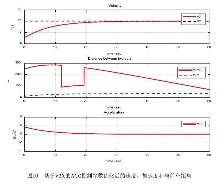 3 实验验证 将OBU接入V2X仿真平台和V2X硬件在环测试平台进行测试验证,可以快速地对控制参数进行调优, 如图9和图10所示分别为基于V2X的ACC控制优化前和优化后的控制结果。参数优化后,加速度和速度的变化更加平滑,提升了ACC驾驶的舒适性,同时与场景车的距离也保持在安全的范围内。