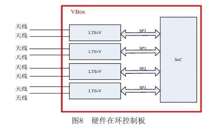 2.2 硬件在环控制板 硬件在环控制板用于发射模拟环境中场景车和路侧设备的消息,BSM、MAP等消息的频率大于等于10 Hz,如果需要模拟20台车和路侧设备的话,硬件在环控制板的设计需要按照200 Hz的发射要求进行。 硬件在环控制板通过PCIE与工控机连接,获取仿真平台中车辆和路侧设备的信息,在SoC中对这些信息按照标准进行封装。 如图8所示,硬件在环控制板由一个SoC和4个LTE-V模组组成,SoC用于处理和工控机的交互,获取仿真平台中场景车和路侧设备的信息。SoC通过SPI分别与4个LTE-V模组连接,LTE-V模组与V2X天线连接,将场景车和路侧设备的信息通过空口对外广播出去。
