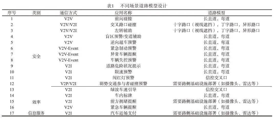 根据《合作式智能交通系统 车用通信系统应用层及应用数据交互标准》的应用场景,通过分析,不同的场景需要的道路模型 如表1所示。